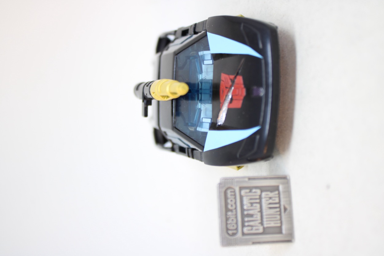 Since you no doubt have multiple versions of this mold already, I'll spare you from explaining that the detail is mostly all the same. The head sculpt is very good, and more like the cartoon. Black horns adorn a white helmet with a gold face, complete with blue optics. His chest is black, with blue stripes surrounding a molded and slashed-out Autobot symbol, with a Decepticon one underneath. I'm kind of surprised they didn't just bolt a new Decepticon symbol over the old Autobot one, but I guess this looks more dramatic. His limbs all move nicely, and rather than bright yellowish orange bits, he now features gold. Looking at the cartoon, this was probably the right move. Similarly, the stills on TFWiki don't show the purple forearm symbol in the cartoon so I'm not going to gripe that it's gone. Despite not being a taller robot with spring-loaded action features, Hasbro captured the essence of the character to the extent that you'll look at it and say "yup, that's him!"