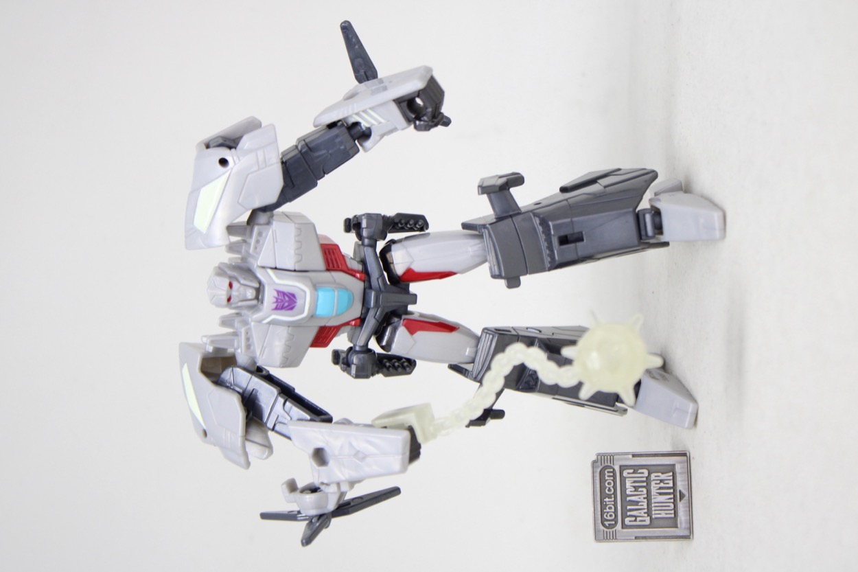 Deco is pretty good. Red on the chest and thighs looks great, and if it were left off I'd not miss it. The fists are painted gray, with the rest of gray parts being primarily molded in color. The blue cockpit and purple Decepticon logo look great, but the reason I bought this figure were the glow-in-the-dark bits. There's a line around his Decepticon sigil, three lines on each forearm, and two big patches on each should painted in very nice glow paint. I wish more things glowed, but everything that does glow does so nicely.