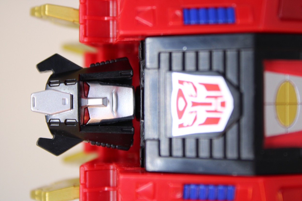 Snarl returns with what I'm told is the most common Generation 2 redeco, red!  My memory of the red arms and legs were that they weren't quite as desaturated, but I may not have seen one up close in quite some time.   The figure seems to match online reference photos, with a bright red chest that matches my memories.  The figure's head is painted like the toy head with a silver crest and silver face, plus red eyes.   As with the original squirt of the mold, this figure includes limited fux-sticker deco.   The chest croshairs remain, and there are some extremely subtle red paint-on-red plastic highlights that may not be visible in some lights.   You also get some neat blue vents on the chest, plus black highlights on the arms and legs that lack some of the color of the original toy's labels.  I think they did a pretty good job, but in their shoes I'd have dropped the red paint on the red limbs and pocketed the pennies or put other color elsewhere.   It is an appropriate redeco, but does not have a lot of dazzle power.  It delivers the promise, it is what you expect.