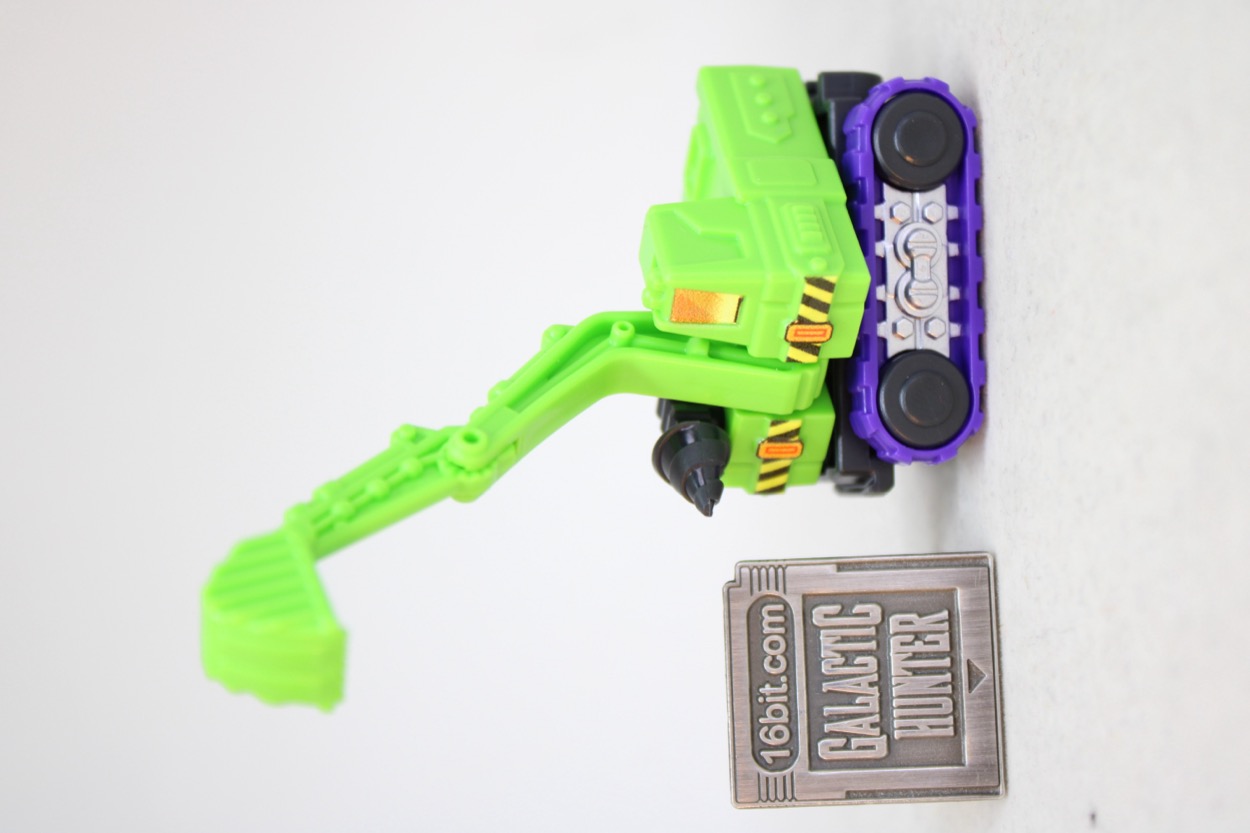 Scavenger has a jointed shovel arm, wheels that don't spin due to the hard plastic treads, and a joint so it can pivot. All of this serves the bigger combiner robot too. It's molded in color except for extensive decoration on the front bumper and window, plus some silver on the treads. I think it looks great, and if this were a vehicle that existed solely for its own sake? I'd say it's worth the three bucks. It's squat and has just enough detail and texture that it doesn't fall flat. You may have other Devastator toys, but this is a pretty good one if you don't. These things technically can't transform, but being able to mash together vehicles into a big guy is an interesting licensing workaround.