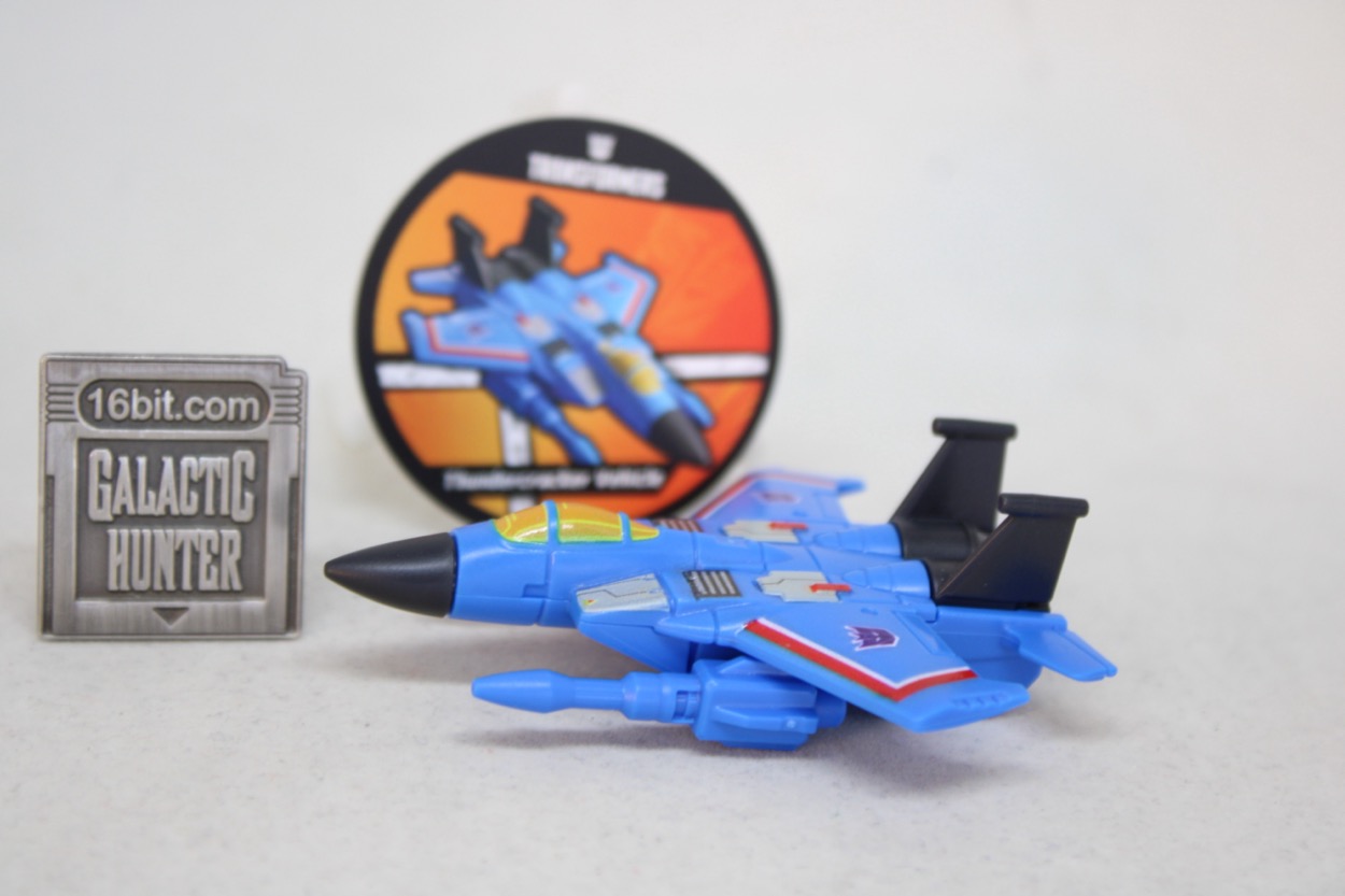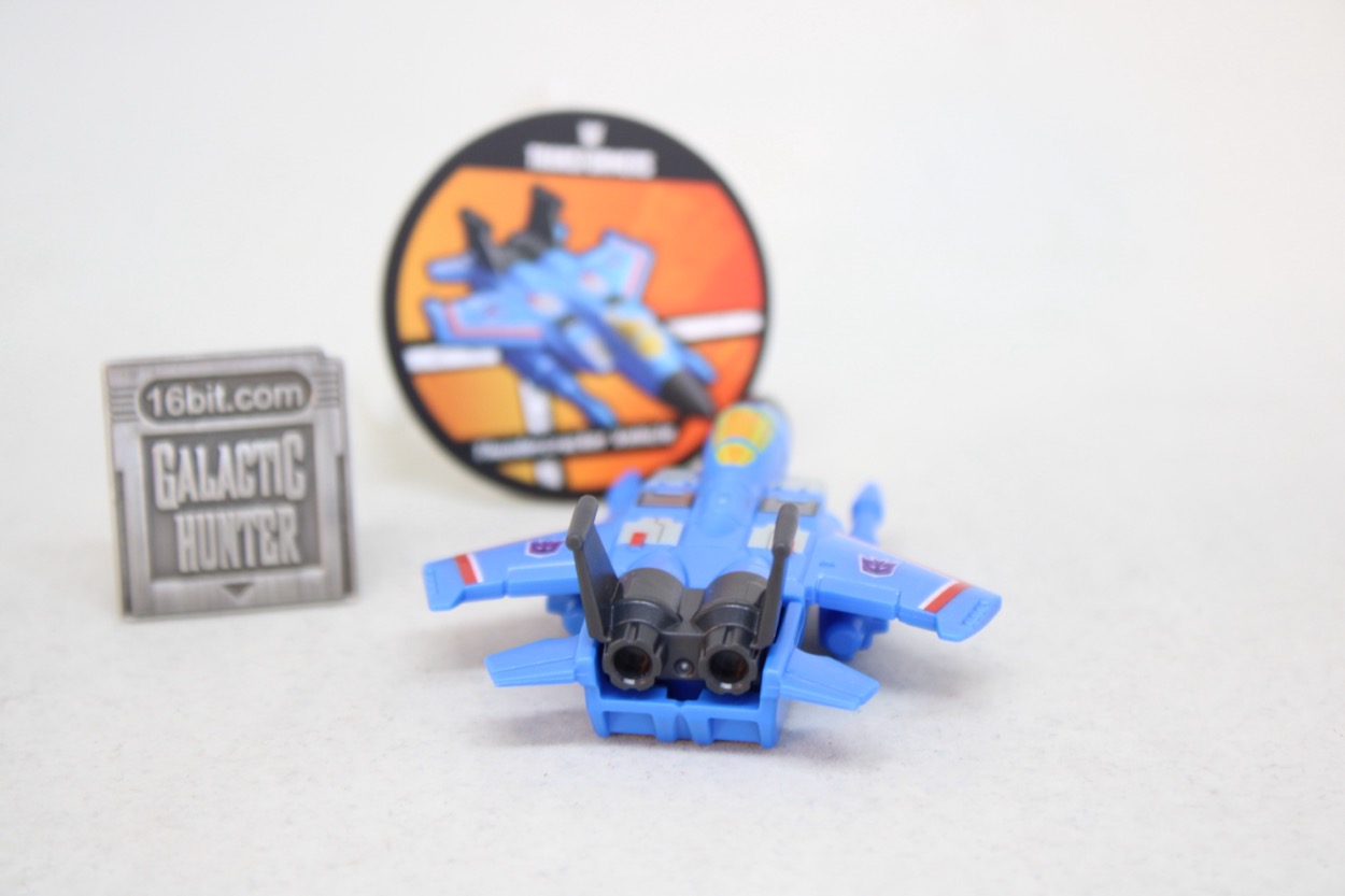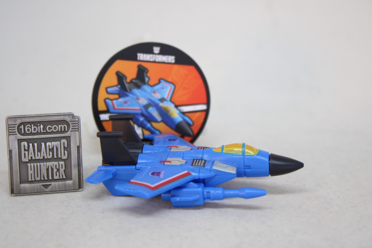 I assume this exists - along with Bumblebee - to save Blokees a few bucks. It's simple, there's no articulation, and the bottom of the jet is completely unpainted. The top looks amazing, with an orange caopy, purple Decepticon symbols, and many of the vents and panels you may remember being stickers back in the 1980s. You don't have to sticker anything, they pre-printed it all for you. It's also a bit over 2 1/2-inches long, so it's a decent size. The cannons mount to the side of the undercarriage kibble, not the wings, resulting in a fairly decent looking little jet. I assume the design was made to be somewhat modular so they can make Thrust or Ramjet by only repurposing some of the pieces.