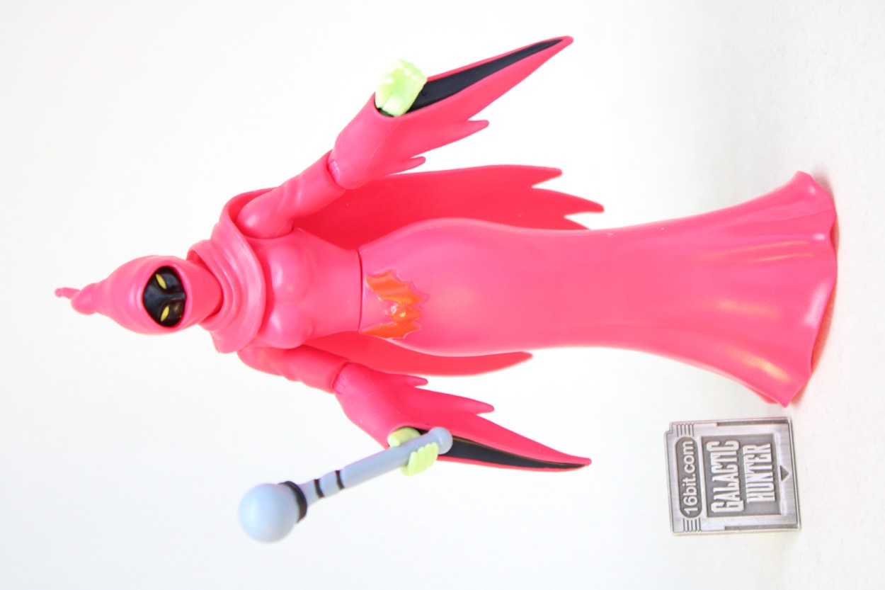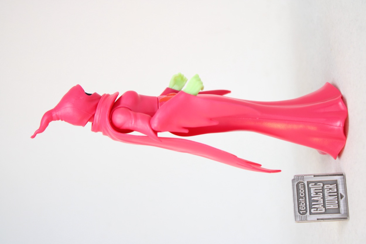 Standing at about 5 1/2-inches tall, she doesn't have any legs. Her dress is hollow, and there's a plug underneath that can fit Cartoon Collection Orko's stand. (No stand is included.) The figure can split apart at the waist. Super7 made their "Classics" figure split just under the bust, which gives the figure a cleaner silhouette. Her arms are jointed like most figures in this line. The elbows, shoulders, and wrists all bend and swivel. The neck is jointed, and there's a cape.
