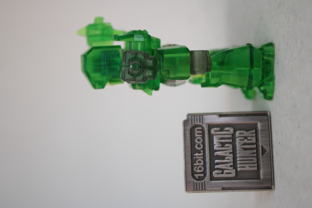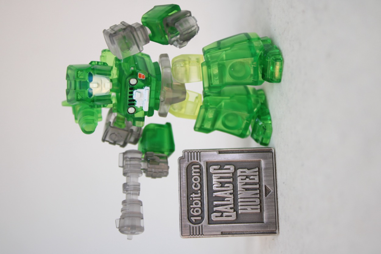 I'm now opening these out of order, and Brilliant-Hound from Blokees is a glistening bright green clear plastic jewel that is going to appeal to one kind of fan and alienate the rest. The color is gorgeous, saturated, and with contrast in all the right places. His face is painted, there are Jeep vestiges, the headlights are painted, and there's a teeny tiny Autobot logo.