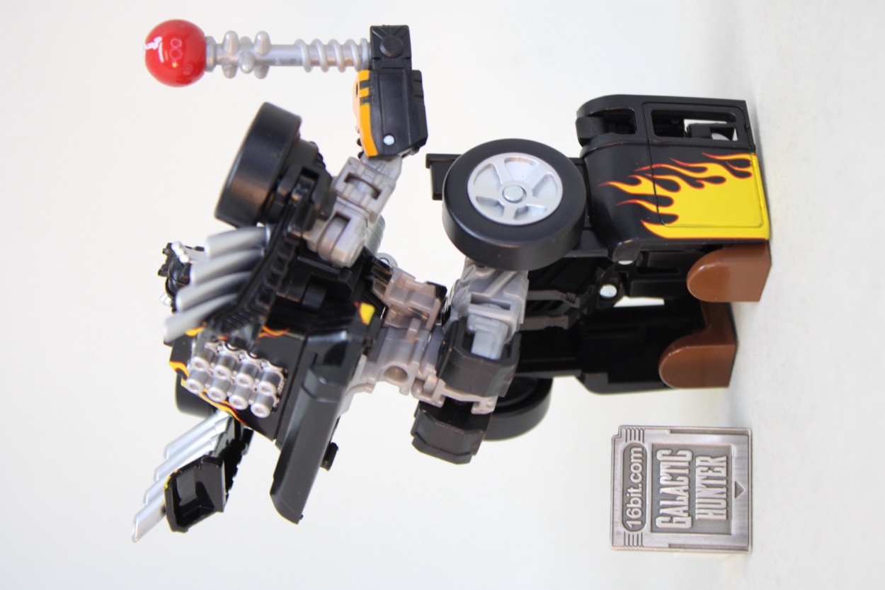 The car is, unsurprisingly, a big Bone Shaker. The tires have no tread, so it's a lot like a bigger Hot Wheels toy. (Twin Mill has tread.) The wheels spin about as well as you'd expect, but there's not much else in the way of action features. You can put the shifter knob in position, which is delightfully goofy. If there's a separate storage position, I have yet to figure it out.