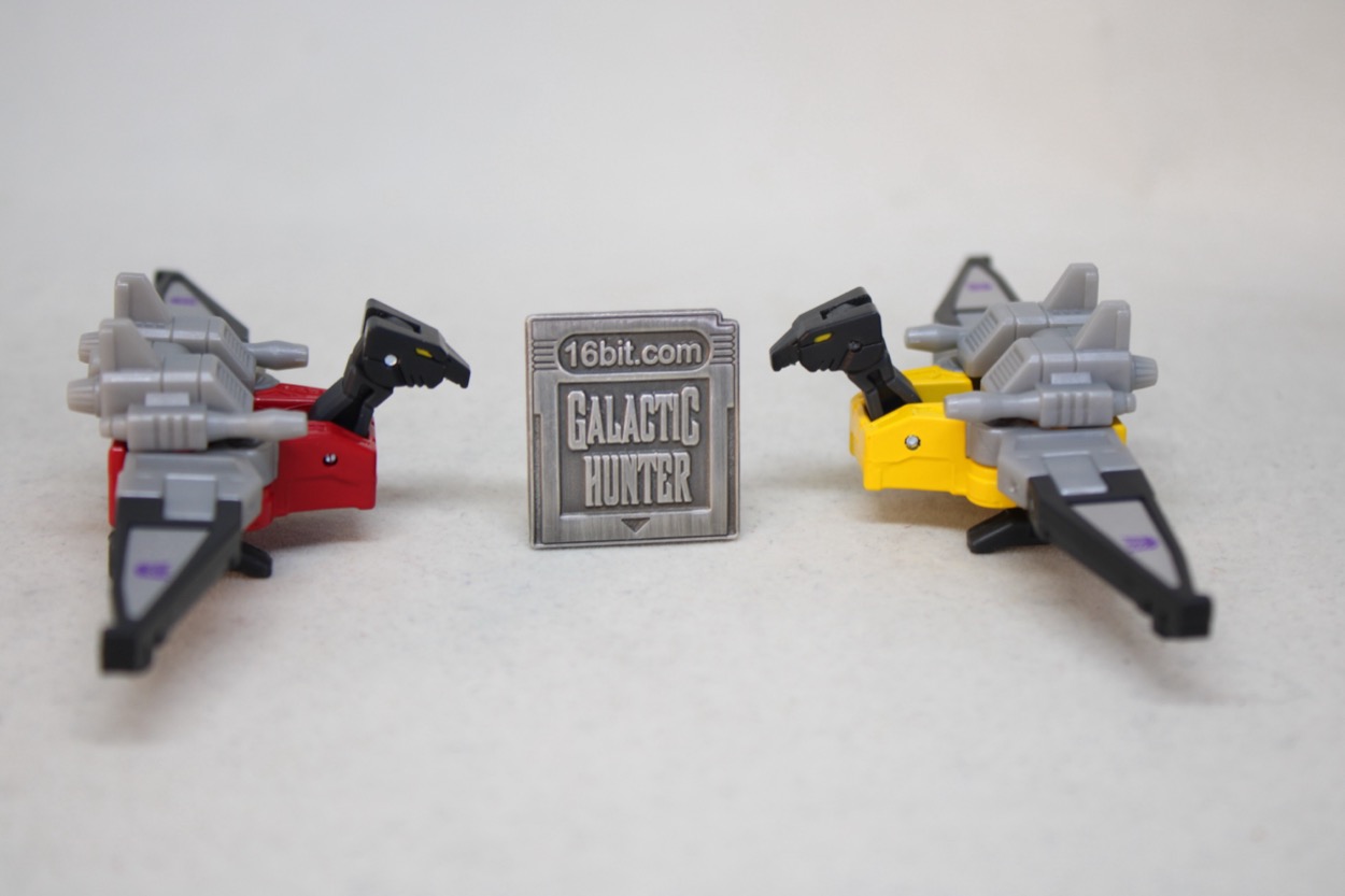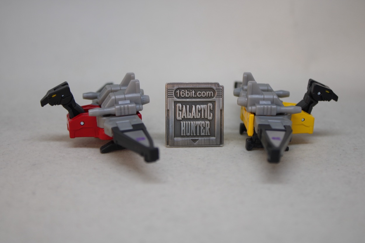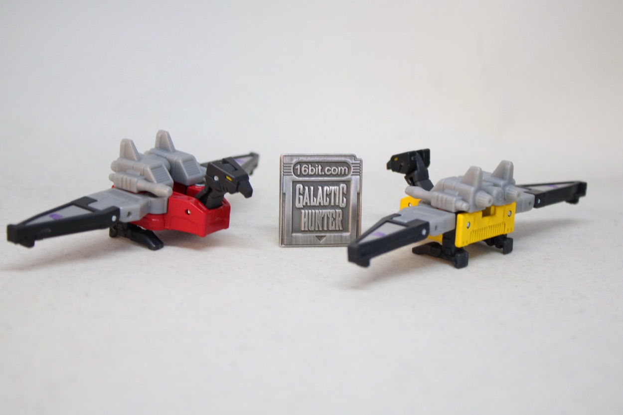 Joining him are Laserbeak and Buzzsaw, making this one of very few times you get two of the same toy in a box together. Each toy has a 3-part kibble piece to make the blasters, which can also be held as a weapon for a bigger 'bot. The tapes are the same size, with a glossy painted red (or gold) chest and gold eyes. The wings and everything else are basically the same, and now fold out and untuck for an elongated wingspan. I think they both look great, if a little bland. The Siege guys had super colorful wings, with Buzzsaw getting a painted beak. These new guys do look more like the cartoon, but the Siege and Legacy birds were so good in their own right that I would recommend hanging on to them. The new wings have silver paint and tiny Decepticon symbols, making them better overall but I once again would not be surprised if Hasbro does new ones later. I can't say these or Siege are better - they're different enough that neither one seems like a loser. But you can dump Siege Ravage.