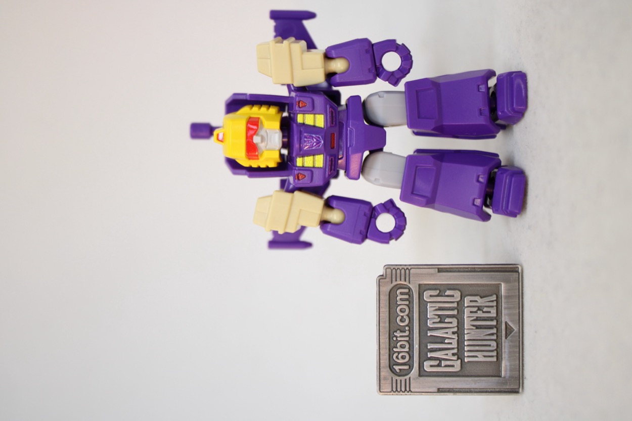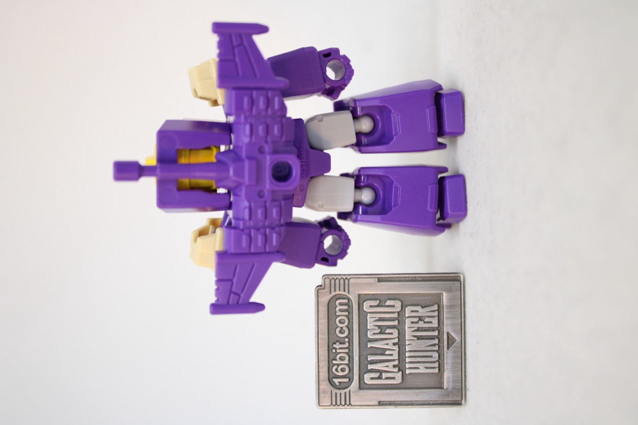 Now mostly in purple, 14 points of ball-jointed limbs await you. Surprising no one, it looks exactly like Blitzwing! The yellow plastic helmet has a red painted visor and gray painted face. The chest has some printed graphical details. Everything else is molded in color. Joints are tight and pretty much perfect, reusing the same hands, forearms, shins, and feet as most other lesser robots in the line. It's kind of perfectly good. As you've seen in other reviews (or experienced) it is kind of unthinkable to have a figure of this size with ball-jointed wrists and ankles. With American toy companies struggling to get anything cheap out, it's kind of astonishing to see a figure in 2026 that's not only good, but it's cheaper and better than a similar product from 40 years ago.