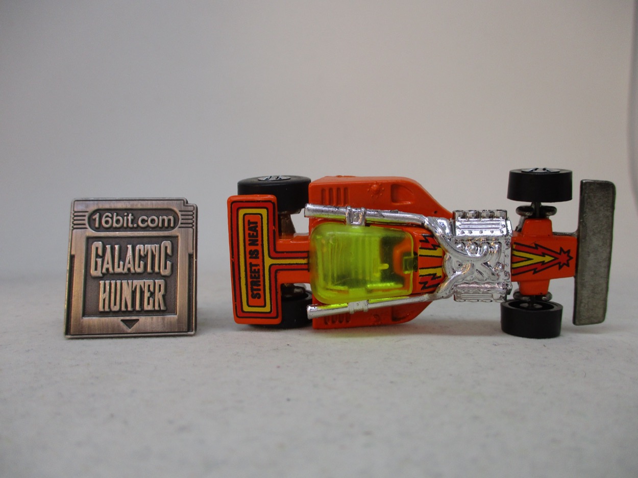 A lot of Hot Wheels of the early 1980s still felt like they came from the 1970s with bright, comic book-esque bursts of color and big bold lines. The spoiler reads "Street Is Neat," and there's a bright yellow windshield. The box from the spoiler's colors run down the body, culminating in a particularly suggestive arrow with a little explosion just in front of the bumper. I love the orange paint and how sharp it still looks. The tampos look great. The chrome on the engine and even the wheels looks really good. None of this would be particularly noteworthy on a modern car, but this survived storage in multiple homes for over four decades before getting to me. It's wonderful to pick up a toy and see very few signs of visible aging.