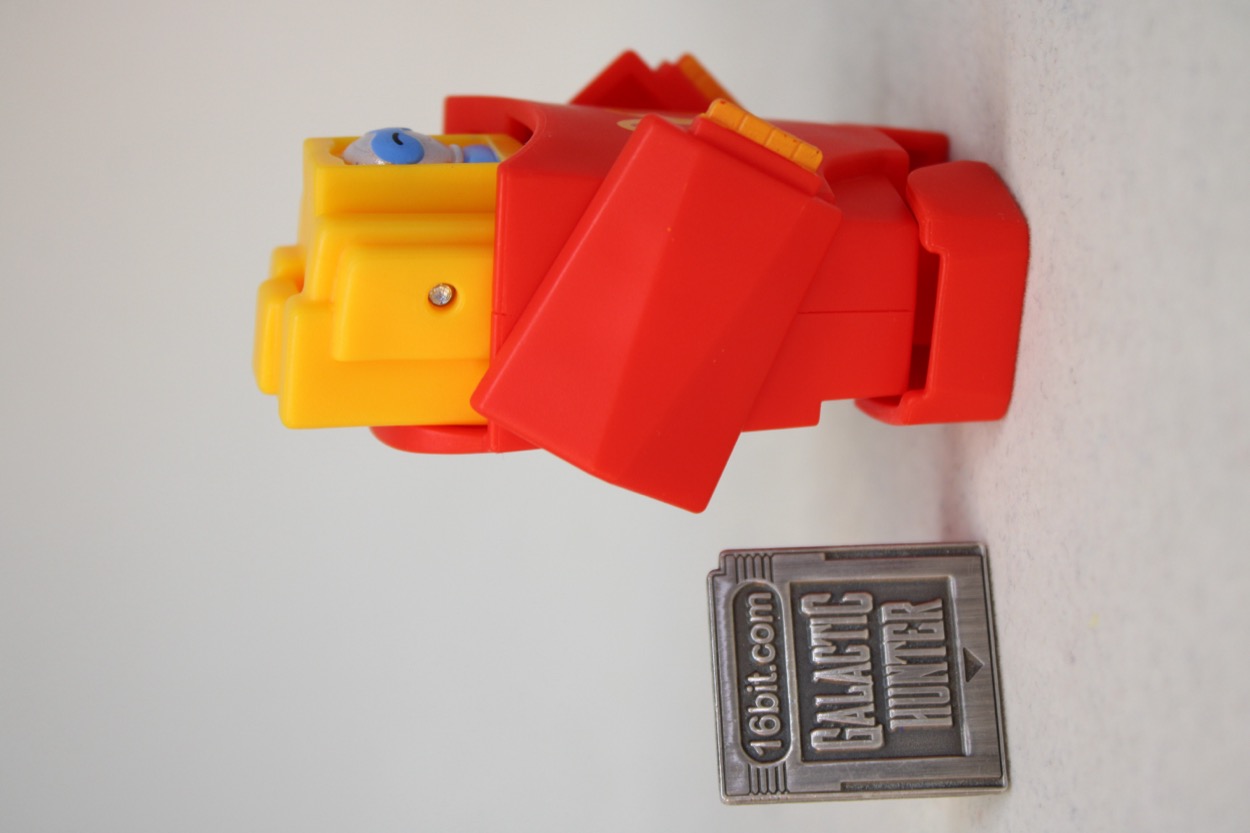 At about 2 1/2-inches tall, these guys could probably hang out with 3 3/4-inch scale or 6-inch action figures as a kind of a Jawa or Ugnaught or other little guy. The feet pull out, the arms swivel, and the head folds out. There's not much to it, and it's all the better for it. Most toy makers are making increasingly complicated figures with more parts, more assembly, and more paint - all of which costs more to do. McDonald's is very cheap, and as such, you get this pretty decent cheap toy with lunch. The face looks like a rather generic robot toy, with a silver neck and face. It reminds me a bit of Leader-1 from Go-Bots in its design, and it's fine. I vastly prefer the original from 1987 with its weird snout mouth, but the modern interpretation certainly feels more refined.