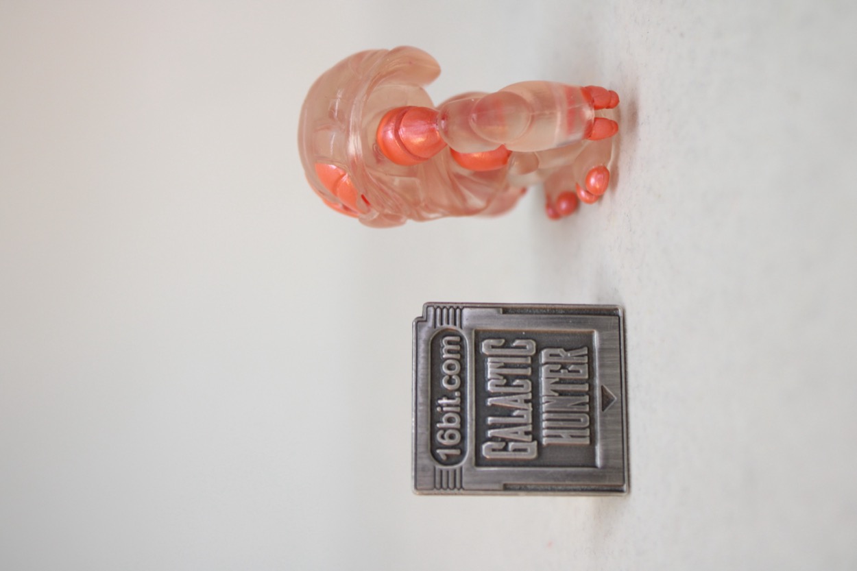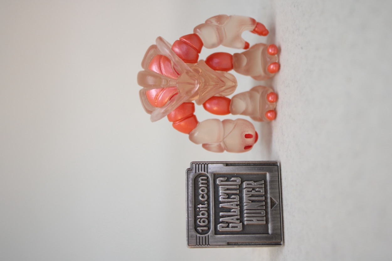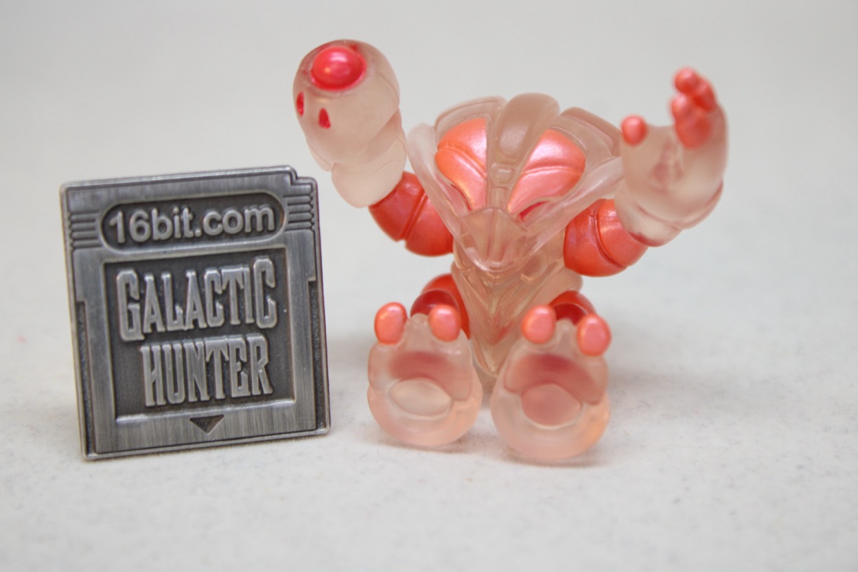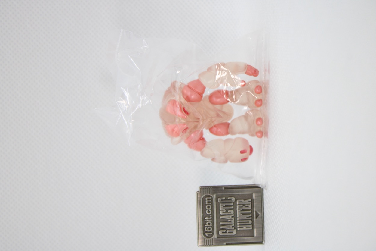 The arms and legs pop off, and can be swapped with pretty much any other Glyos system compatible part. That's good! They're sized similarly to Blokees Defender-class toys or Hasbro's old Battle Beasts, roughly 1 1/2-inches tall. They look sort of like a crab mixed with Mega Man, and in this case colored like some translucent sea life. The core plastic is a clear almost colorless pink. The figure has red on his eyes and blaster-esque arm, with metallic pink on the upper arms and legs plus toes and fingers. You could probably have it scampering around in the bottom of your aquarium and it would fit right in.