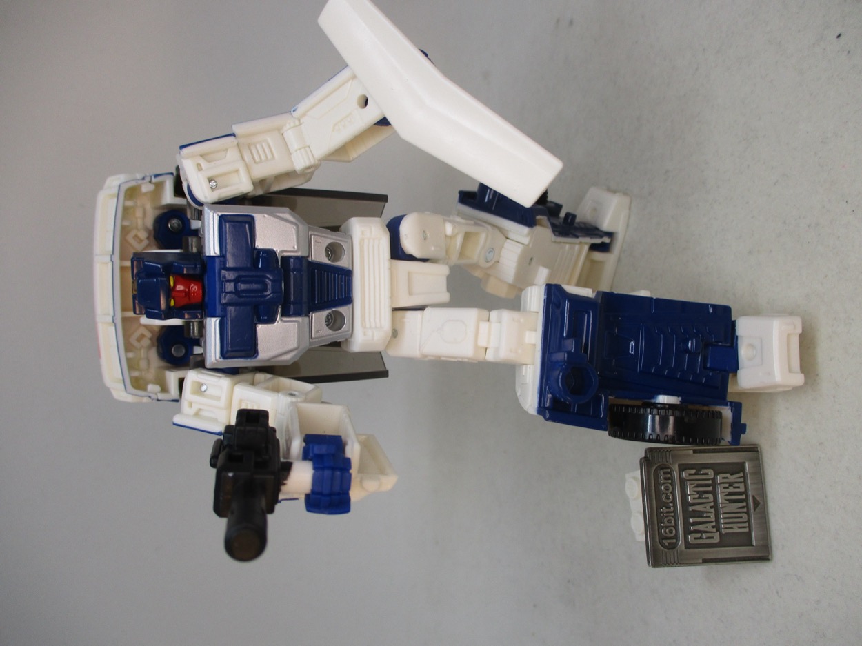 It's a pretty great little toy. The G2 version is now much cheaper - it was blown out at Walmart in value-priced 2-packs for Black Friday - but you want this white one, with a red hood, the blue chest, and the lack of faux sticker adornment. Takara-Tomy and Hasbro clearly conspired to make something similar to the cartoon. You can tell, because the head has yellow eyes and not a visor, like the original toy. he doesn't have a purple Decepticon sigil on his chest though - and the white isn't quite as off-white. Still, the general swaths of color are the same and even though he doesn't have wheel shoulders, it gets the point across. Those wheels are on his backpack. I still like what they did, as it has a little more color than the cartoon model and has a fairly good range of movement for a guy whose main purpose is to be bisected and mounted on Menasor's arm.