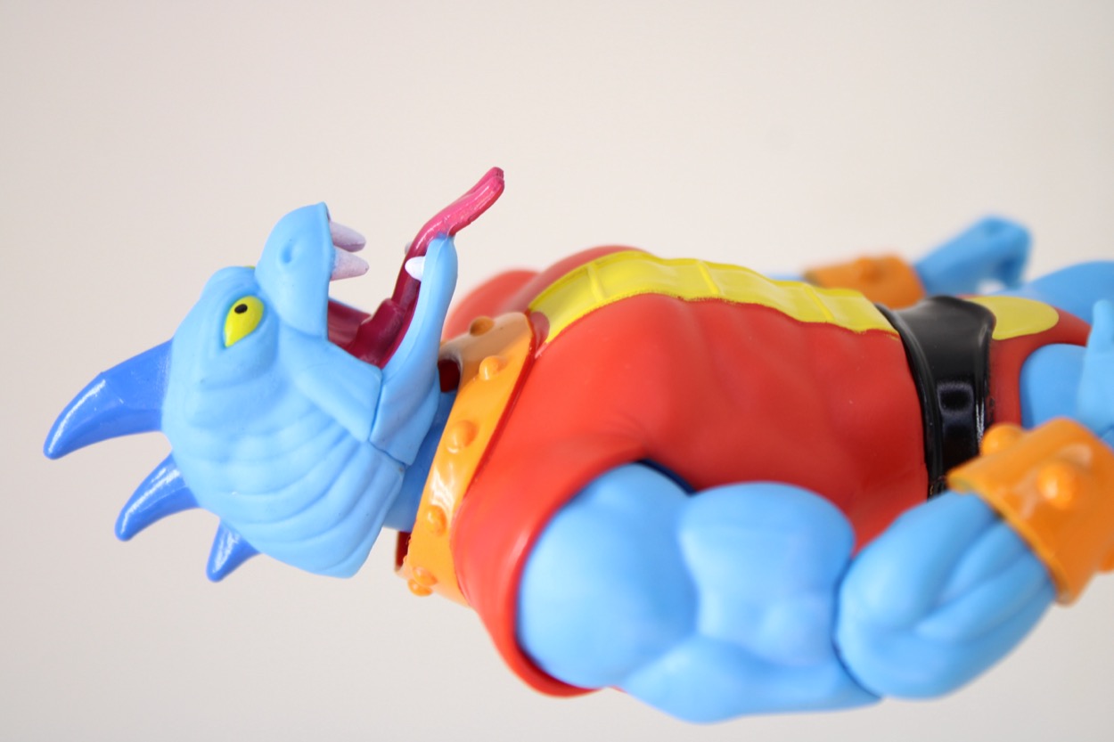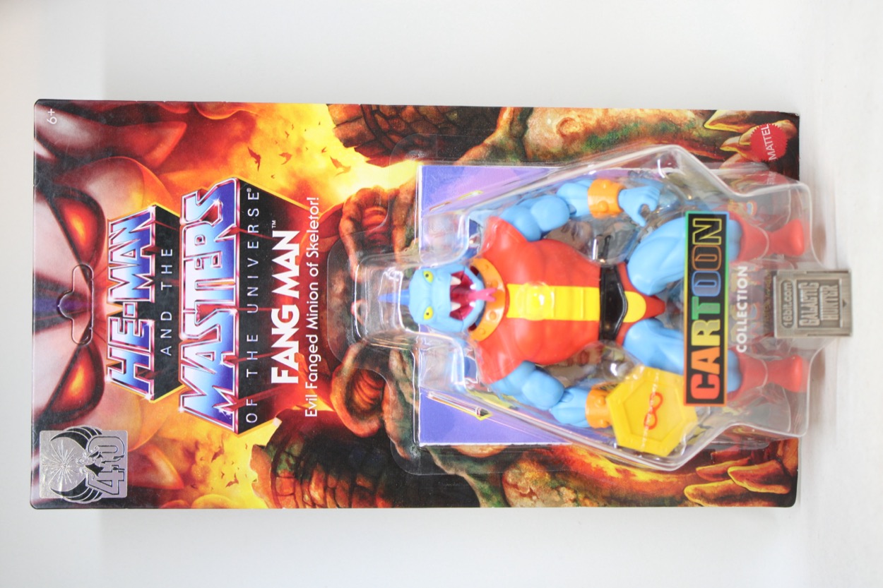 Most of the Cartoon Collection releases take steps to sort of merge "cartoon" with "toy," with small details that really drive home the point that this is a different figure... or more importantly, a reason to shell out twenty bones on a toy you already own. Maybe it's a new accessory, a color change, or a smirk, but each figure has been giving new heads and new stuff to make you feel like that answer is "yes." The Fang Man figure, on the other hand, has a shortened muzzle, eyes that look in slightly different directions, shorter head spikes, and arguably too much detail. I'm pretty sure the cartoon lacked lower fangs. He definitely had ears. This figure has gills, but the Matty version didn't. Also, the posture on the cartoon and previous figure was a bit more slouching forward.