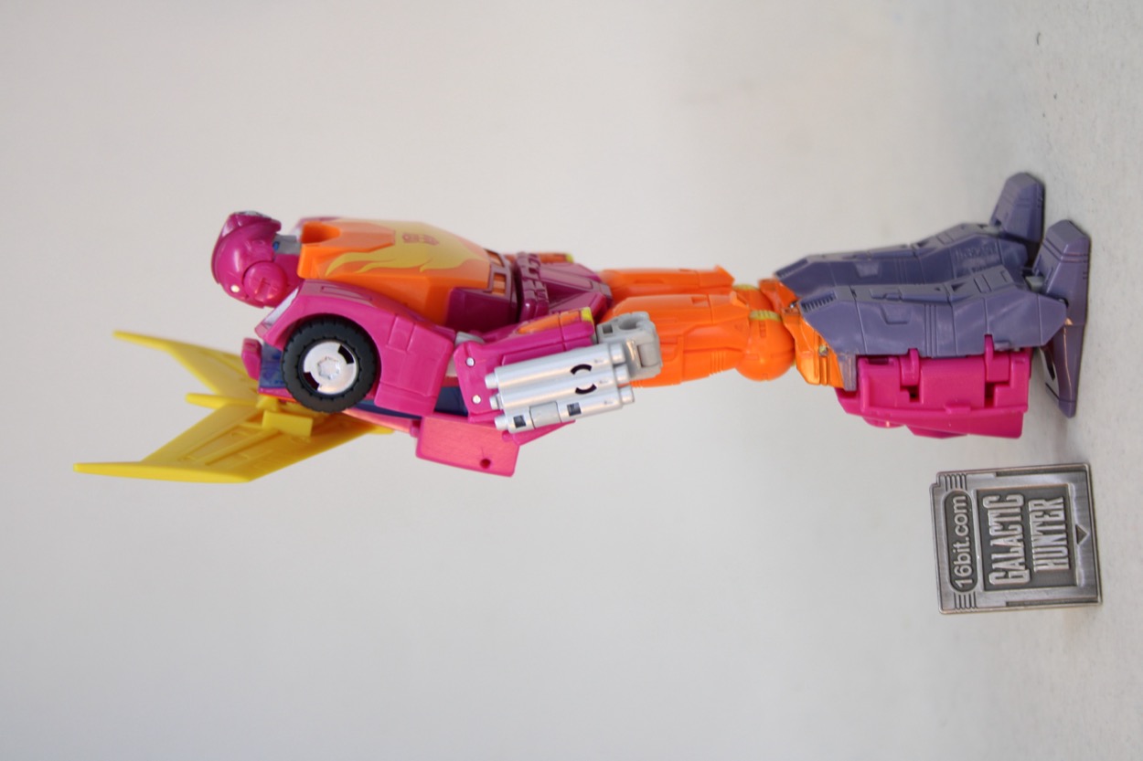 The car looks great, and is a vast improvement over the last one. A huge yellow joint marred the roof of the original, which this fixes. I prefer the new magenta colors, but the orange and yellow (and gray) from his arms are something of an eyesore. Perhaps if Hasbro and Takara-Tomy try again - and oh, I hope they don't - they might make the change. They may also elect to paint the center of the big yellow spoiler, but I don't really feel it's necessary. His flames look great, the blue windshield looks good, and the pipes are fine. Takara-Tomy has a Transformers Masterpiece Edition MPG-20 Hot Rod Style Gen coming, which actually paints the spoiler, and fixes the elbows, but the forearms are still visible in car mode. And he's not magenta. Also, he's $125. Is it worth it? Not to me, but a larger toy built on the same form is possible for those who want to pay up. The wheels of the Style Gen toy are also much nicer... but it's not magenta. And it lacks the gear.