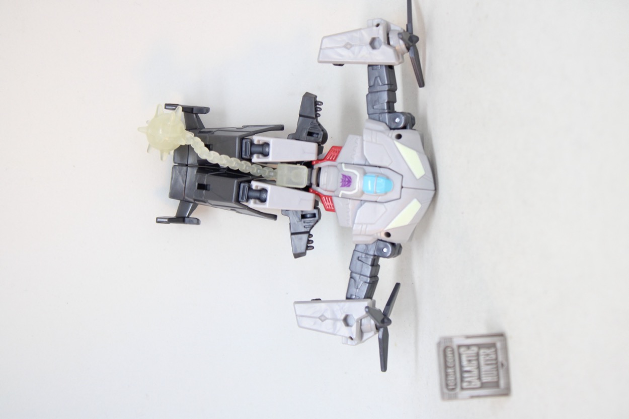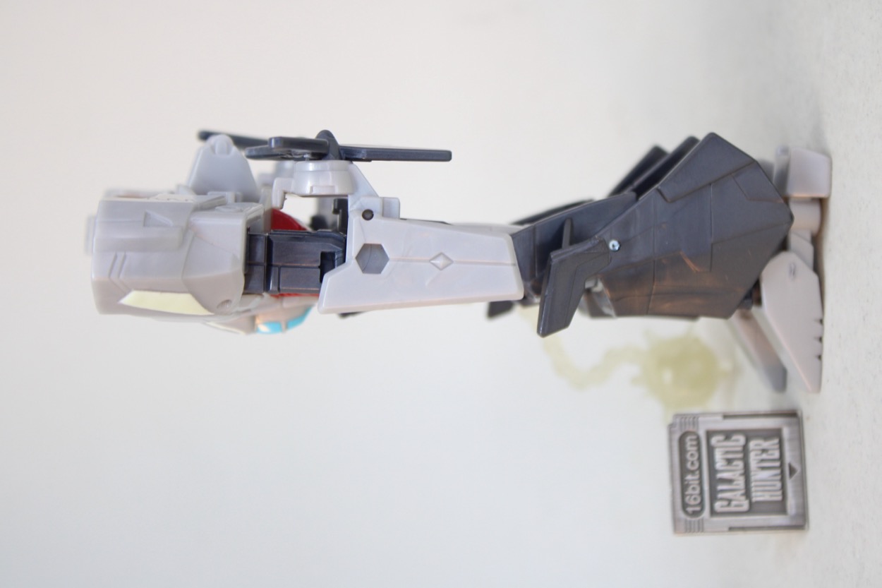 His chopper mode is fine, but not amazing. The blades lock in place, and it's very clever. But it means you can't position them any other way - how it looks is how it is. The blades spin nicely, but there's no landing gear and not a lot of paint. In this mode you can see the glowing lights in the front, with the robot's chest lights hidden behind the cockpit and the forearm lights rotated out of the way. I'd say the size and general vibe is roughly below that of a 1990s Deluxe-class toy which, adjusted for inflation, is pretty fair. A $10 Deluxe from 1996 would be about $21 in today dollars.