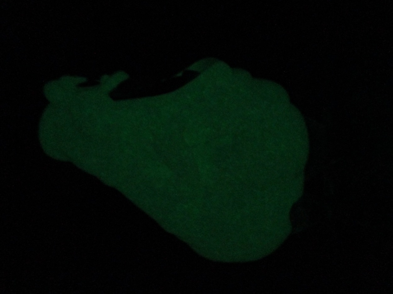 The chase figure and the regular figure look identical - I only photographed the glow one. It's a perfectly good glow color, not quite as bright as I remember him on TV. The eyes are black, the slime is this really nice glossy color. Unfortunately, like the Devo figure, the glow is pretty terrible. When exposed to UV LED, it's pretty weak. When exposed to a CFL bulb it charges OK, but the glow fades so fast it's hard to capture on camera. It needs the Sun to really get much out of it, and even then it's not super bright. The left arm not glowing is probably a fluke on my figure, but it's also just one more thing that would make me say you probably shouldn't bother chasing this one down unless you must have everything that can possibly glow in the dark. Your money is better spent elsewhere. I'm looking forward to seeing how Hasbro's Ecto-Glow "The Green Ghost" turns out in the coming months, as their figures react well to UV and amazingly to the Sun.