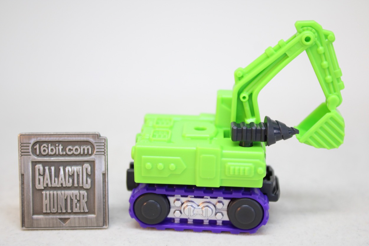 Scavenger has a jointed shovel arm, wheels that don't spin due to the hard plastic treads, and a joint so it can pivot. All of this serves the bigger combiner robot too. It's molded in color except for extensive decoration on the front bumper and window, plus some silver on the treads. I think it looks great, and if this were a vehicle that existed solely for its own sake? I'd say it's worth the three bucks. It's squat and has just enough detail and texture that it doesn't fall flat. You may have other Devastator toys, but this is a pretty good one if you don't. These things technically can't transform, but being able to mash together vehicles into a big guy is an interesting licensing workaround.