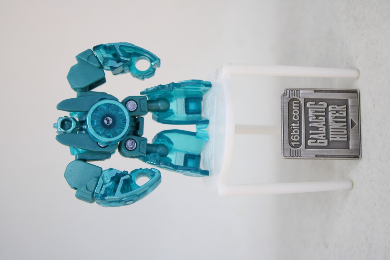 The little guy has a little paint, with a few silver and teal highlights. The clear plastic looks good and I pray will hold up, as it can become more brittle with age. Micronus Prime the Mini-Con has decent articulation for a toy of his size, but there's only so much you can do without it popping apart. Hasbro's restraint was reasonable, and yet he still has 5mm fists. These are used to grip the handlebars of his bike mode, and he has little spurs on his heels which tab in some slots on the bike.