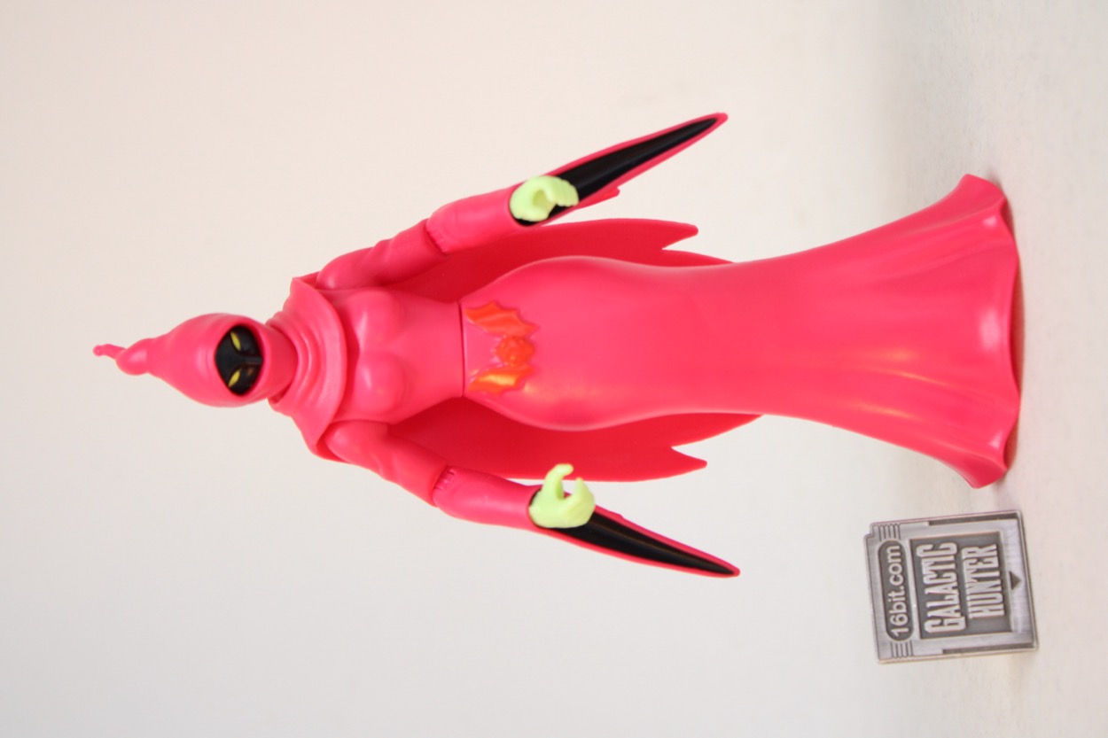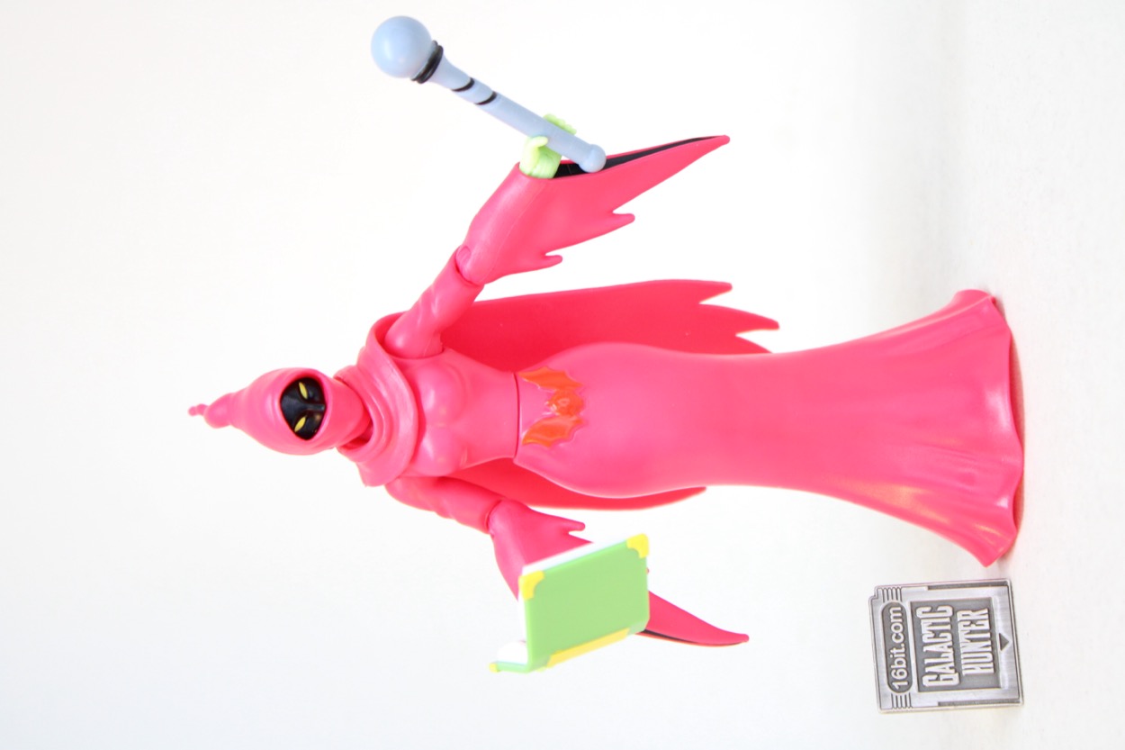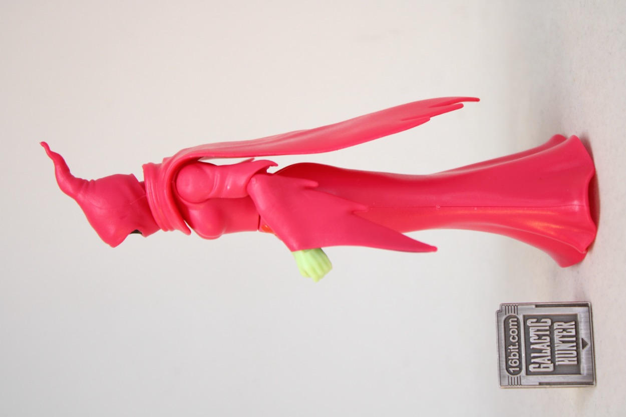 Standing at about 5 1/2-inches tall, she doesn't have any legs. Her dress is hollow, and there's a plug underneath that can fit Cartoon Collection Orko's stand. (No stand is included.) The figure can split apart at the waist. Super7 made their "Classics" figure split just under the bust, which gives the figure a cleaner silhouette. Her arms are jointed like most figures in this line. The elbows, shoulders, and wrists all bend and swivel. The neck is jointed, and there's a cape.