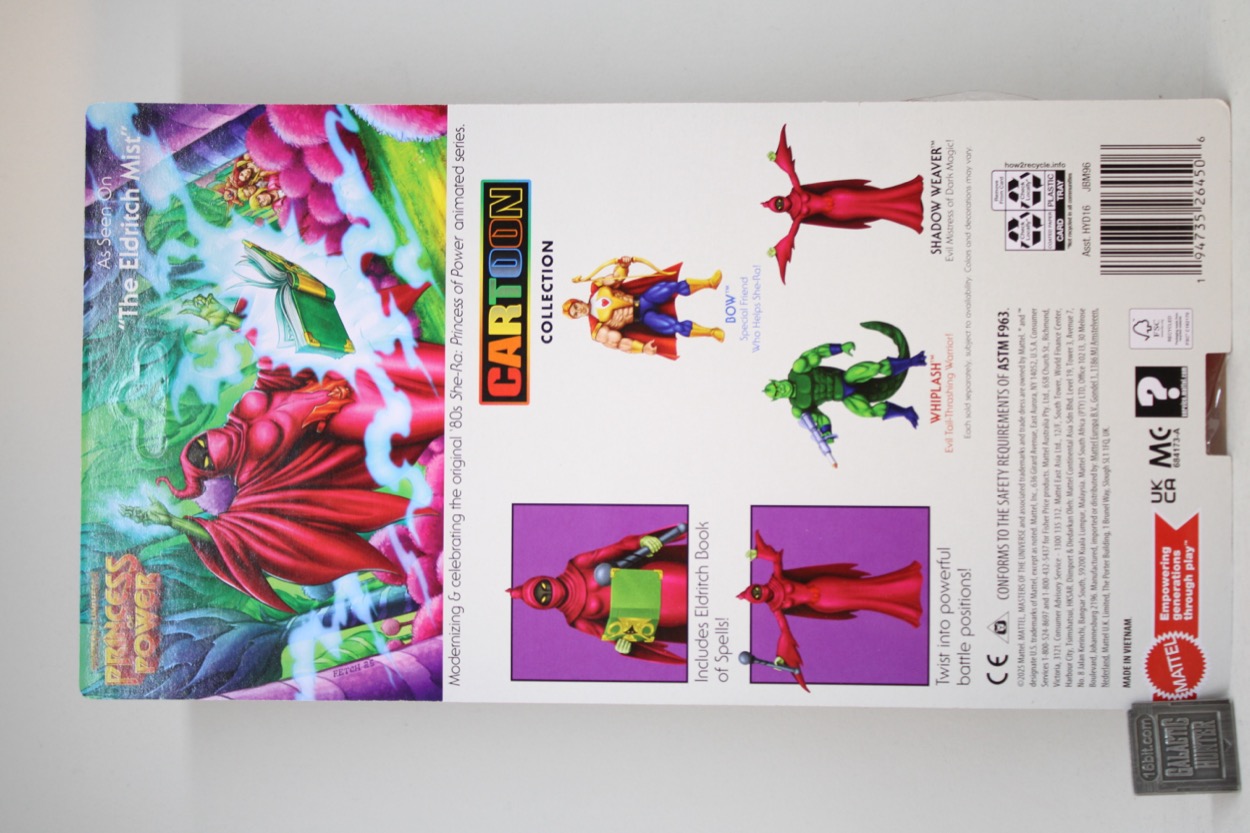 Mattel doesn't mention She-Ra or any Princess of Power on the packaging for He-Man and the Masters of the Universe Cartoon Collection, probably to make sure Shadow Weaver sells to He-Man fans who would be embarrassed about buying "girl toys." It's a weird thing to have shame about buying toys but it comes up a bit in collector spaces, as some people see their plastic people as collectibles or whatever and can't just have a good time. It's a shame, their life could be better.