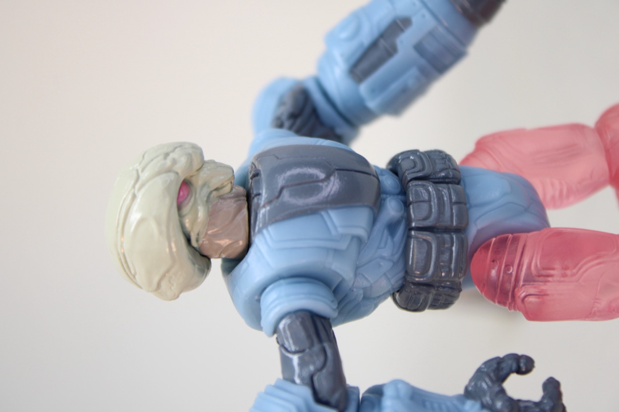The new one is a little less stylized but feels more like a traditional action figure. Covered in panels with seams and the occasional rivet, it looks like something you might have had in the 1980s. You can see inspiration oozing out of every part, with distinctive fingers and rockets on the soles of his very chunky boots. The evolution is like seeing Mario Pheyden turn into Master Chief Pheyden, but the articulation and build are very similar. Each joint on the original Pheyden is replicated here. You can swap out hands, you can exchange torsos, you can trade shoes if you like.