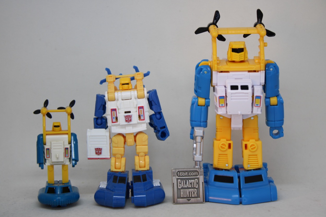 He's a pretty sturdy robot, on par with modern releases like Speedia Cosmos, Legacy United G1 Optimus Prime, and their ilk. He also towers over the recent Bumblebee and Bumper toys, is more or less expected in our current scale-obsessed production era. Hasbro keeps the major milestones intact, with the head stuck to the fans and the feet becoming the front of the boat. Things contort and fold in new ways, though, but you're still getting something that's very true to the original toy complete with lack of Autobot chest symbol.