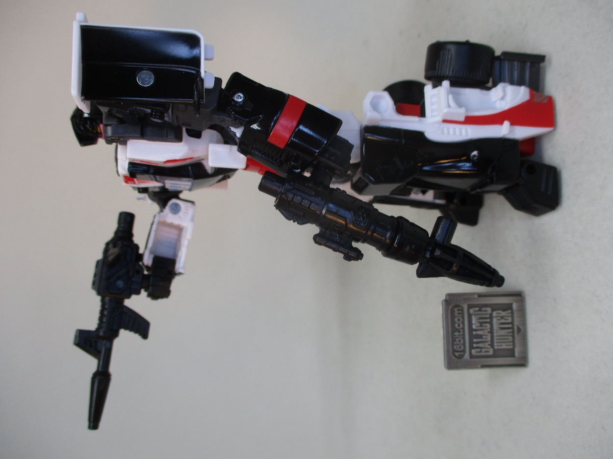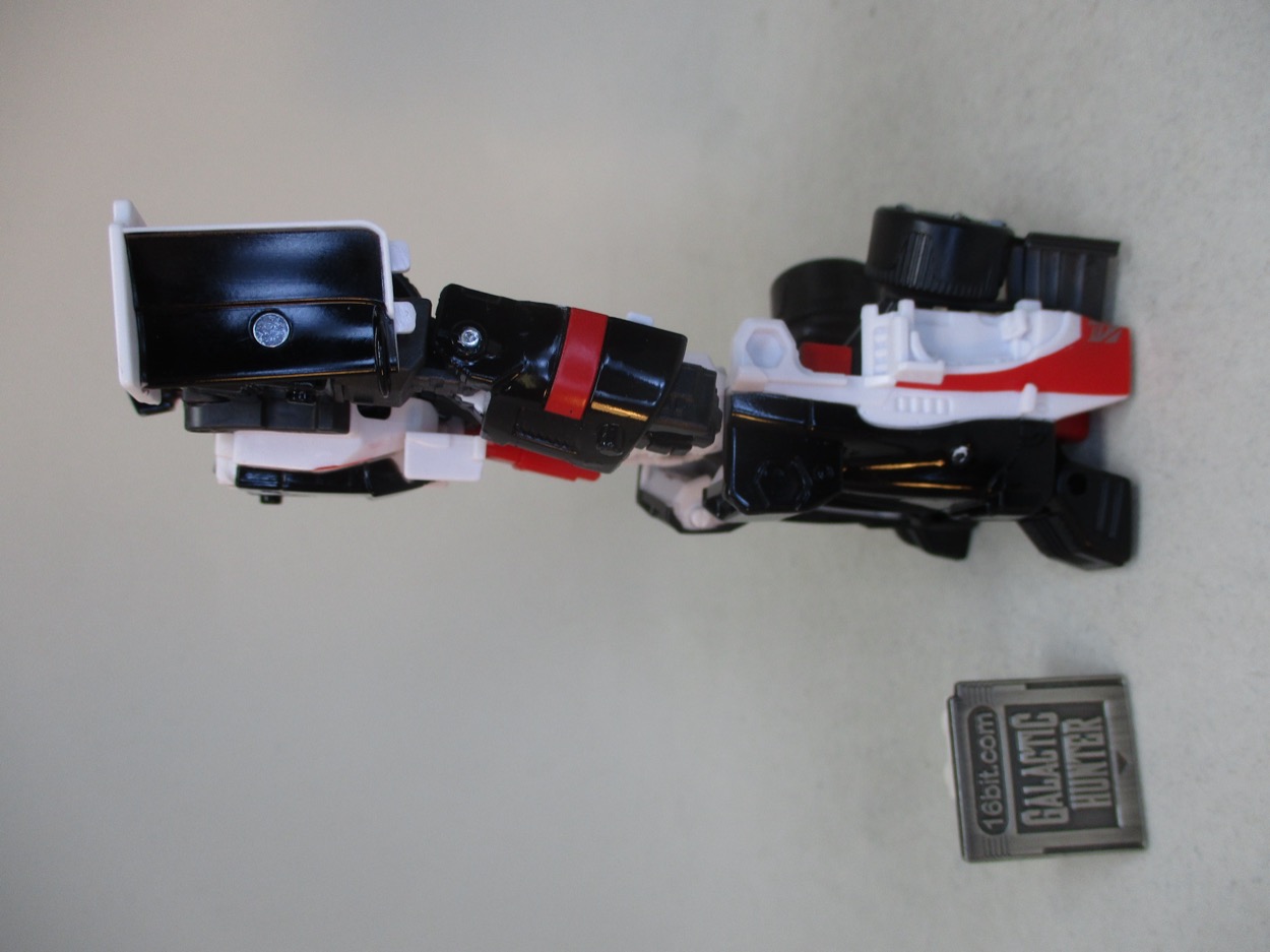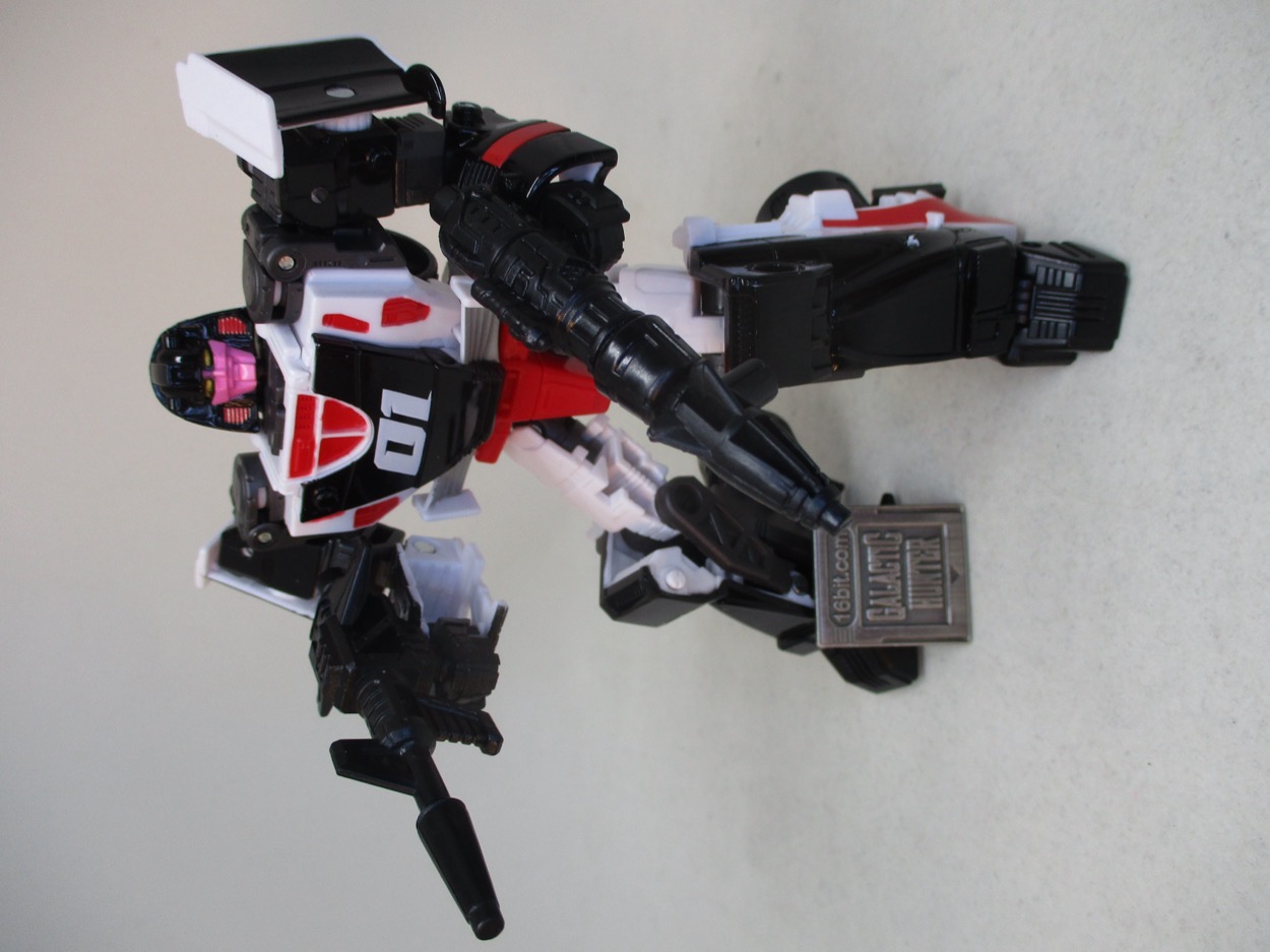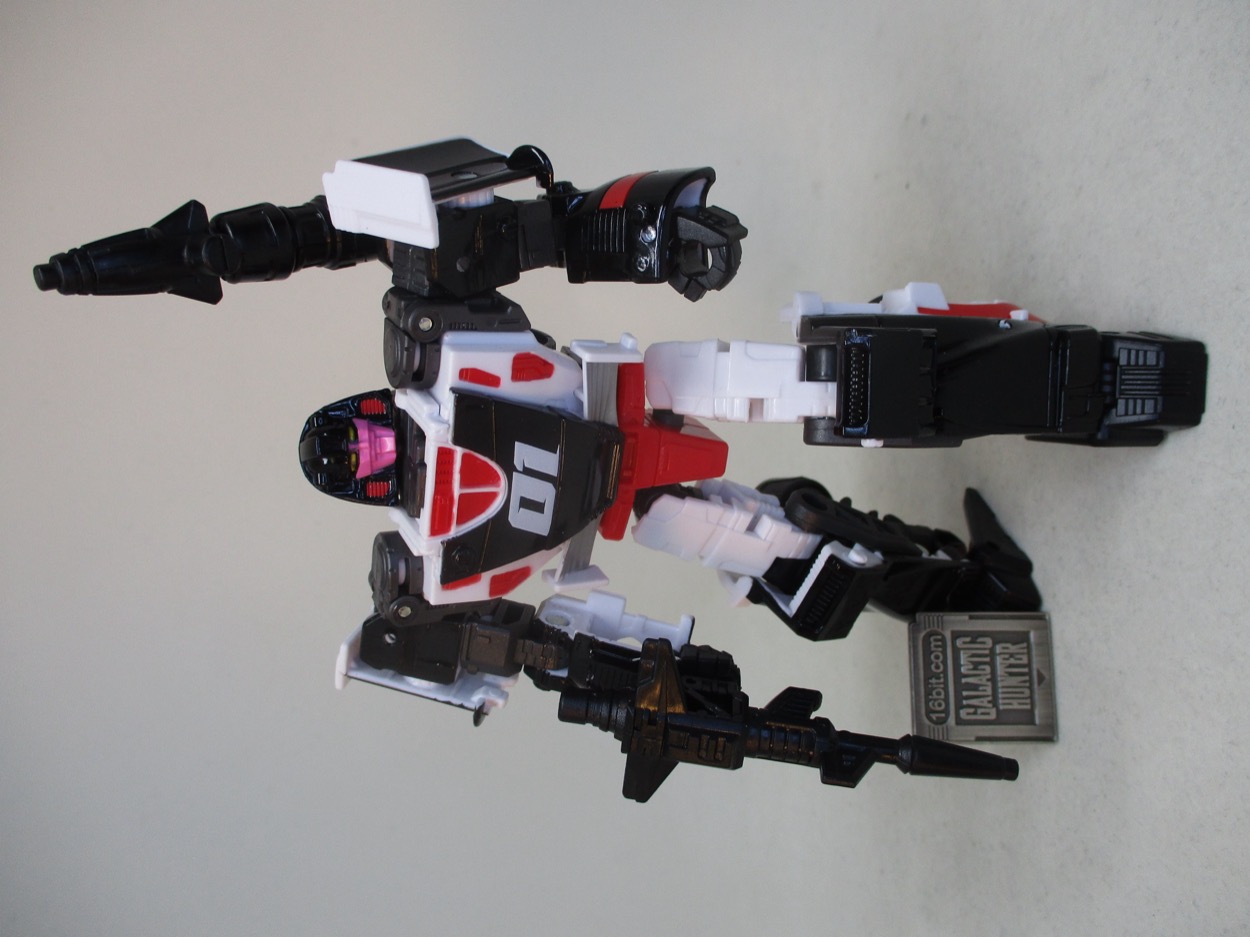This toy applies GoBots Crasher deco to Siege Mirage, and the results are fun. The toy head is painted black and pink, while the body is mostly white with some black molded bits and a lot of glossy black paint. This one is as good as the other releases, with 5mm holes behind the arms to plug in weapons or she can just hold them in her hands. Deco is inspired by the original GoBots toy, with an 01 on her, but the colors are a little different. I assume it's different enough if someone gets angry, not quite matching the cartoon or the toy perfectly - but you get where they're going. It also leaves the door wide open for a GoBots version, if someone wanted to make one, but I assume that ship has long since set sail and nods to those toys is all you're going to get from here on out. Since I could always use more Decepticons, I'm happy to have something like this to add some variety to the shelves.
