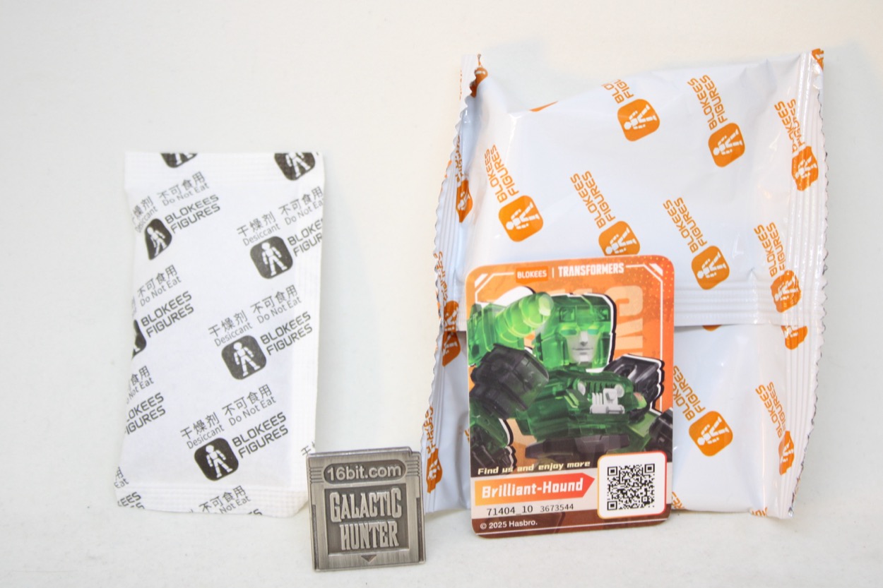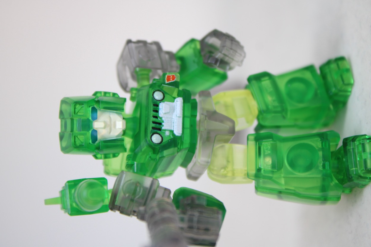 I'm now opening these out of order, and Brilliant-Hound from Blokees is a glistening bright green clear plastic jewel that is going to appeal to one kind of fan and alienate the rest. The color is gorgeous, saturated, and with contrast in all the right places. His face is painted, there are Jeep vestiges, the headlights are painted, and there's a teeny tiny Autobot logo.
