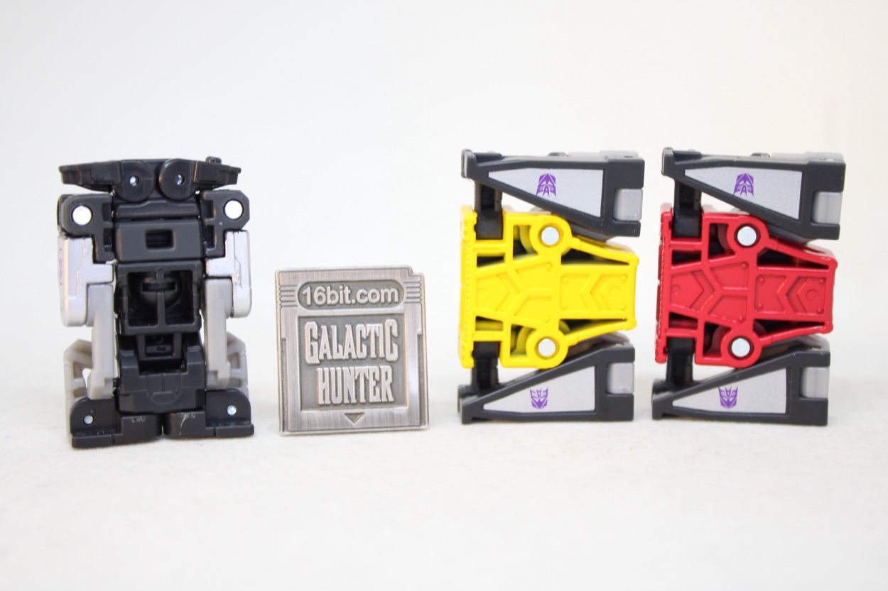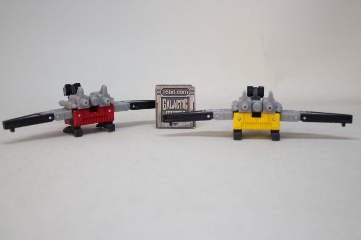 Joining him are Laserbeak and Buzzsaw, making this one of very few times you get two of the same toy in a box together. Each toy has a 3-part kibble piece to make the blasters, which can also be held as a weapon for a bigger 'bot. The tapes are the same size, with a glossy painted red (or gold) chest and gold eyes. The wings and everything else are basically the same, and now fold out and untuck for an elongated wingspan. I think they both look great, if a little bland. The Siege guys had super colorful wings, with Buzzsaw getting a painted beak. These new guys do look more like the cartoon, but the Siege and Legacy birds were so good in their own right that I would recommend hanging on to them. The new wings have silver paint and tiny Decepticon symbols, making them better overall but I once again would not be surprised if Hasbro does new ones later. I can't say these or Siege are better - they're different enough that neither one seems like a loser. But you can dump Siege Ravage.