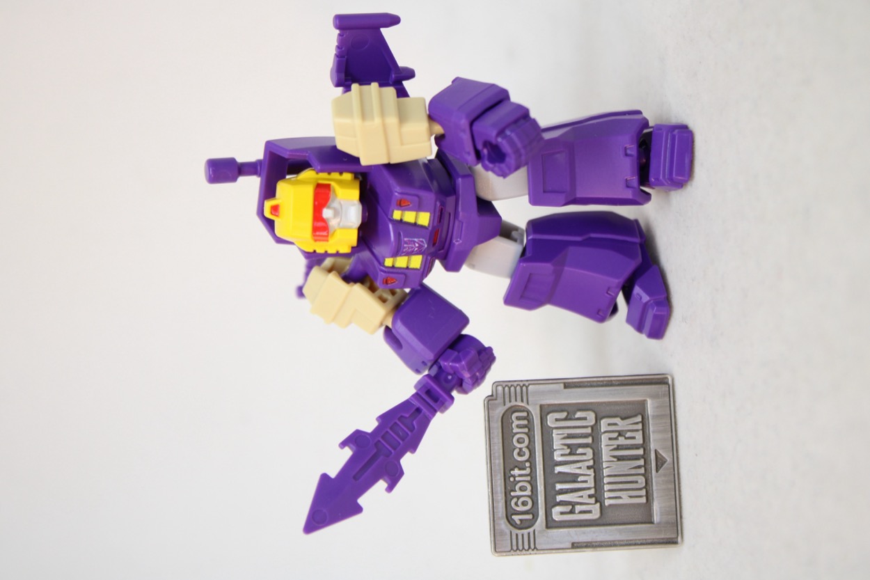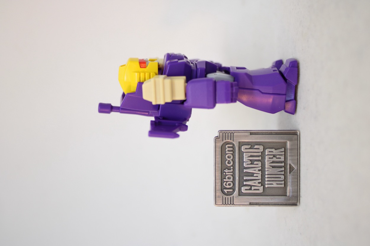 Now mostly in purple, 14 points of ball-jointed limbs await you. Surprising no one, it looks exactly like Blitzwing! The yellow plastic helmet has a red painted visor and gray painted face. The chest has some printed graphical details. Everything else is molded in color. Joints are tight and pretty much perfect, reusing the same hands, forearms, shins, and feet as most other lesser robots in the line. It's kind of perfectly good. As you've seen in other reviews (or experienced) it is kind of unthinkable to have a figure of this size with ball-jointed wrists and ankles. With American toy companies struggling to get anything cheap out, it's kind of astonishing to see a figure in 2026 that's not only good, but it's cheaper and better than a similar product from 40 years ago.