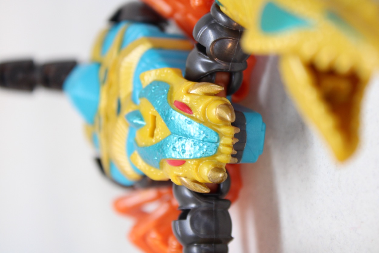 The opaque, golden plastic shows off detail much better than a clear yellow. The new toy is covered in cool bumps and various spiny things with the kind of carapace detail you'd like to see on a good Zerg toy. The jagged pincher claws have 5mm ports inside . There are more - there's one on the creatures back and another between his legs, neither of which serve much purpose in this mode. The metallic green paint is just gorgeous and is a perfect nod to 1990s CG coloring, and you can find it in some more places too. Check out around the elbows, and of course on the head and back of the cobra. I especially like that the new snake chin is a different color.