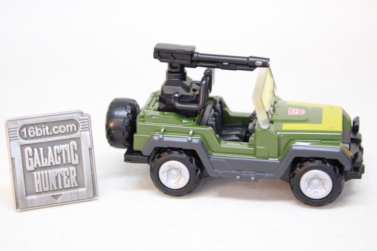 The car itself is a nice size, with a jointed windshield, a movable cannon, and spinning wheels. And a spare tire. It's not quite the 1984 Hound toy, nor is it totally a new modern thing - you'll find a lot of elements of multiple Hounds here.