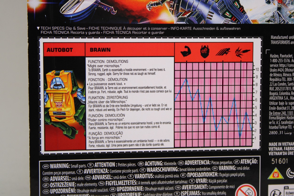 Hasbro's retro-pack Brawn is the lesser of two figures in the second wave... and he's pretty good. A version of this mold with the toy head was sold as Studio Series 86 Brawn a couple of years back, and later, a "dead" Brawn. This one aims to be the "toy" Brawn, using toy coloring and a toy-inspired head. But, you'll recall, the original toy had weird hooks for hands, a Jeep grille, and those panels hanging off his shoulders. It's not an exact 1984 upsized toy, but it's about as good as you're going to get from repurposing the 2023 toy's tooling.