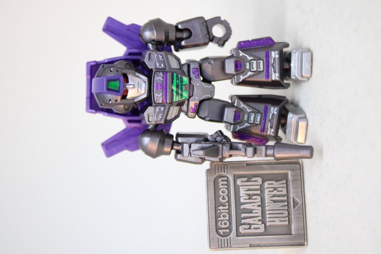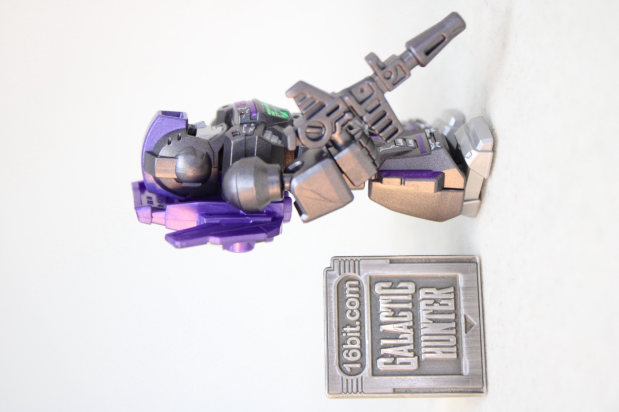 Assuming it doesn't shatter, I really like this figure. The metallic gray color really sizzles, the purple metallic paint cooks, the lighter silver feet look great too. The green on the chest and back are no slouch, and you can't deny the red eyes behind the visor look great. The impressive cockpit/wing backpack has a lot of decoration on it, plus two backpack holes. It looks great - and is the only deco you'll see on the back of the figure.