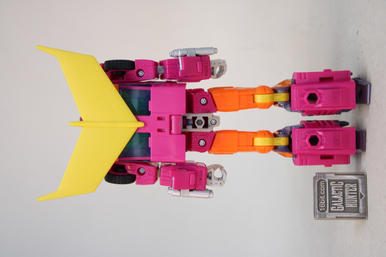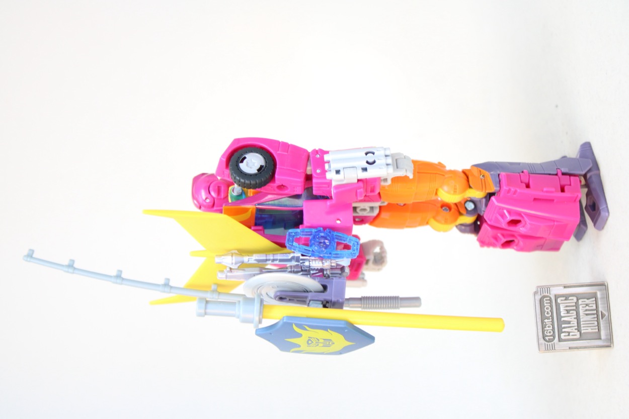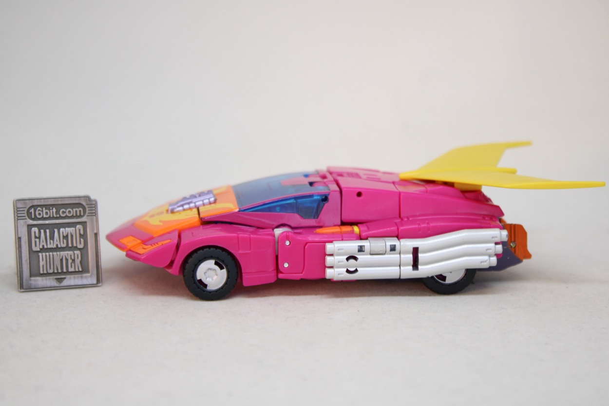 The car looks great, and is a vast improvement over the last one. A huge yellow joint marred the roof of the original, which this fixes. I prefer the new magenta colors, but the orange and yellow (and gray) from his arms are something of an eyesore. Perhaps if Hasbro and Takara-Tomy try again - and oh, I hope they don't - they might make the change. They may also elect to paint the center of the big yellow spoiler, but I don't really feel it's necessary. His flames look great, the blue windshield looks good, and the pipes are fine. Takara-Tomy has a Transformers Masterpiece Edition MPG-20 Hot Rod Style Gen coming, which actually paints the spoiler, and fixes the elbows, but the forearms are still visible in car mode. And he's not magenta. Also, he's $125. Is it worth it? Not to me, but a larger toy built on the same form is possible for those who want to pay up. The wheels of the Style Gen toy are also much nicer... but it's not magenta. And it lacks the gear.