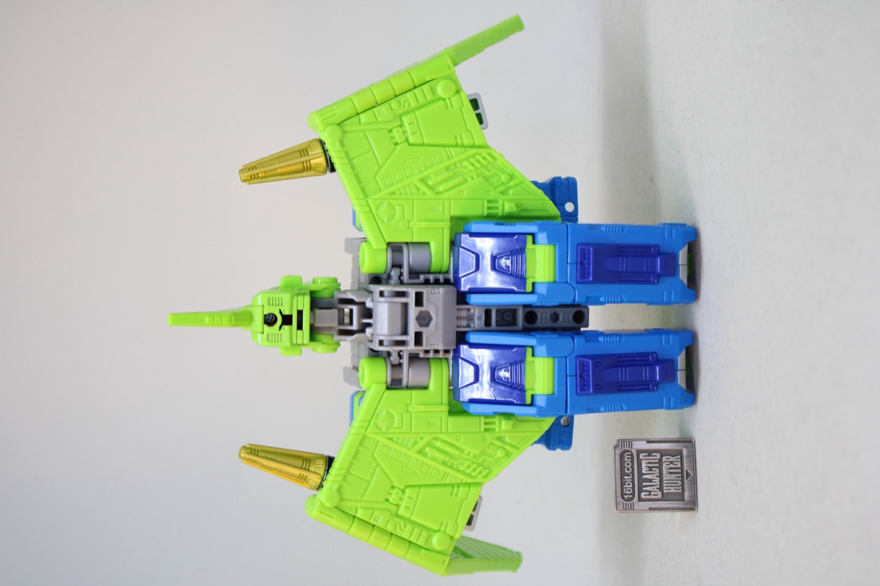 The robot mode is nicely jointed, and the flying reptile/prehistoric not-a-bird/whatever pterosaur has moving wings, toes, jaw, and neck. That's pretty good, most dinosaur toys don't have much movement. You can plug his blasters in his wings, plus he can carry the sword on his back with 5mm sockets. It looks great, but I wasn't really expecting the beak, crest, and head to all be the same green. The red eyes pop nicely, there are a lot of circuit details sculpted all over, and it pretty much delivers on the promise of the concept art.