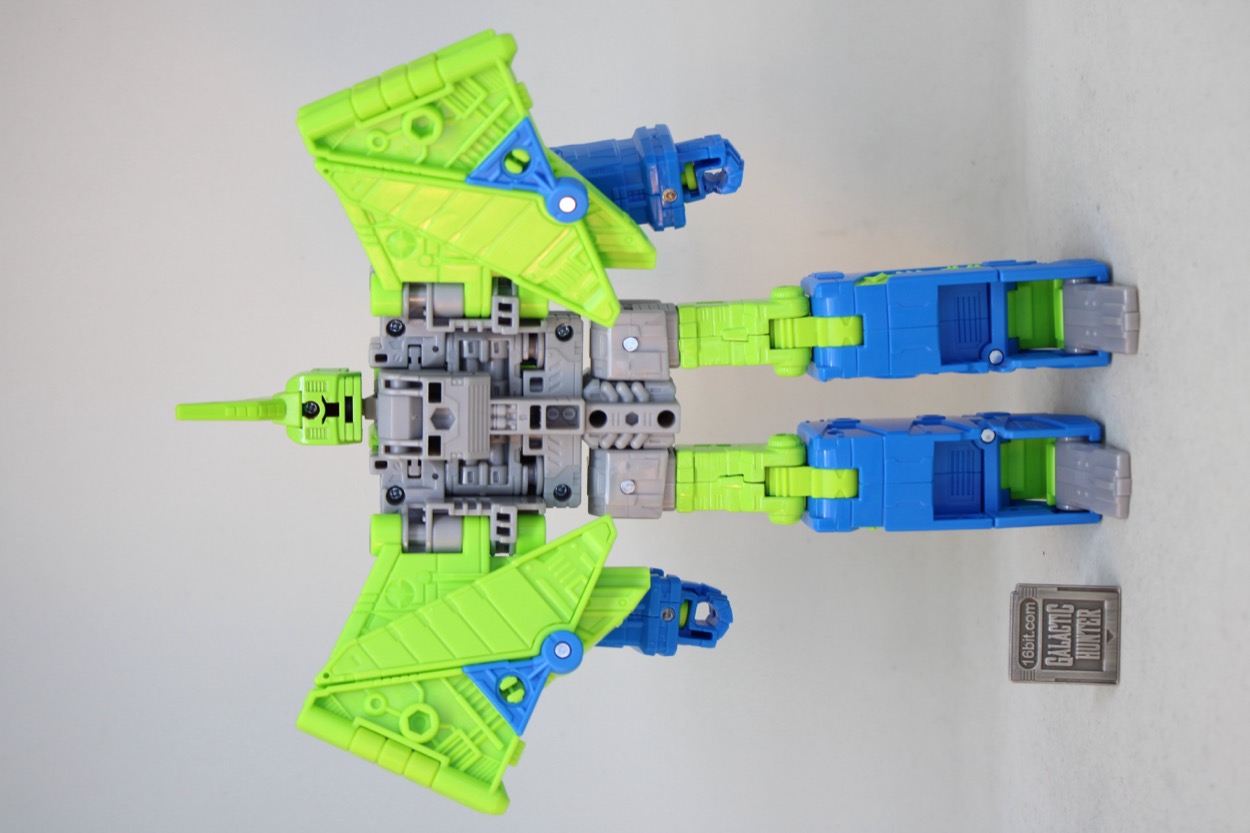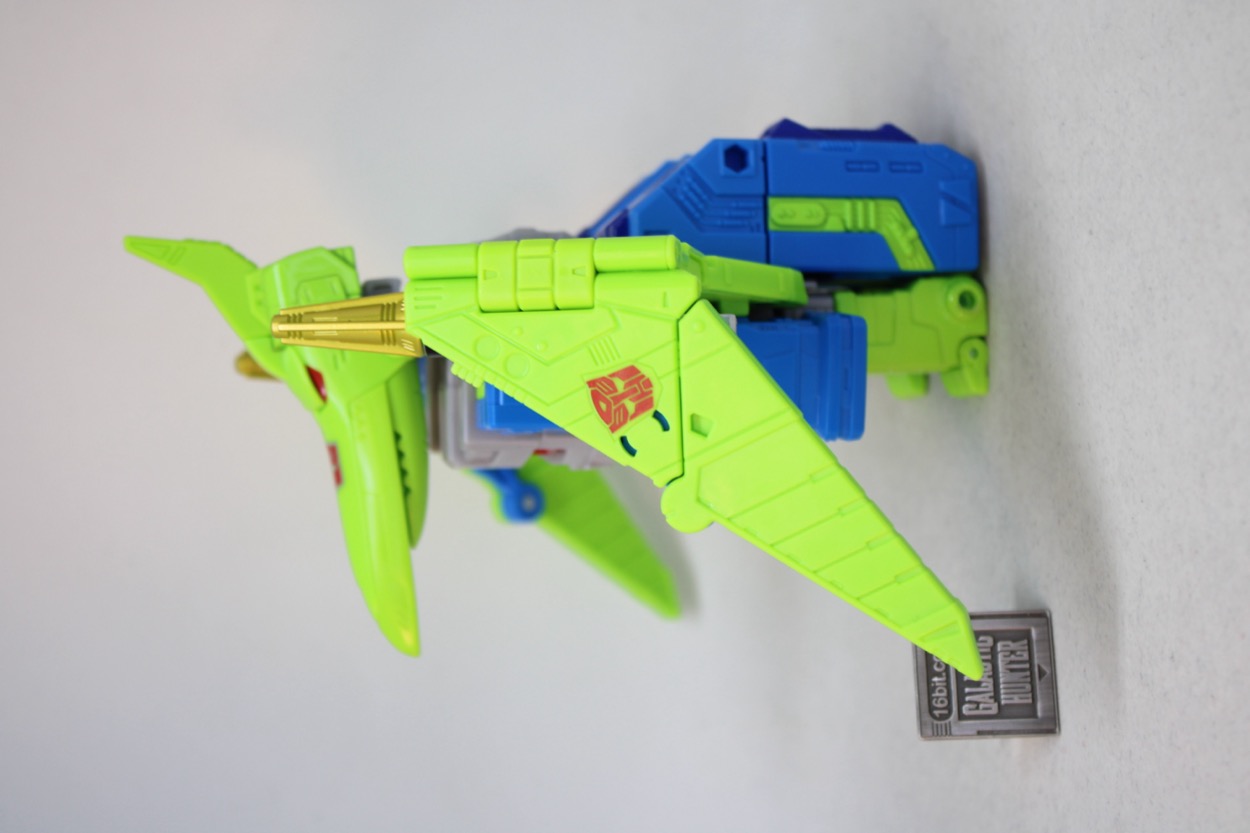 G2 Dinobot Swoop isn't satisfied to be a redeco of Studio Series 86 Dinobot Swoop - he also gets a new face. The original toy was big, good, and pretty easy to transform. This one is also simple, and has the added benefit of a face plate that matches the toy more than the cartoon. Check out that visor! And that weird mouth! It looks like a new character, and that's before you factor in the bright green detailing and blue lower legs. The mold is still tight, and the joints ratchet nicely. The figure has a lot of elements molded in color, but a lot of paint as well. For some reason, it's not very UV-reactive, so don't bother breaking out your black light LED flashlights for this set.