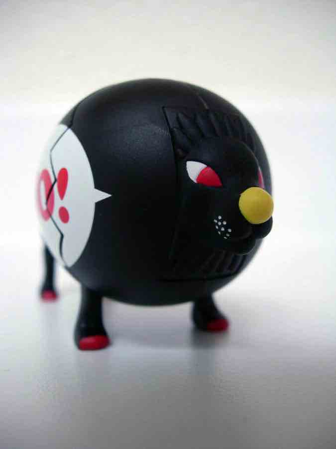 BanDai's Tamagoras figure toys are somewhat infamous in the USA. The best-known release of them were as licensed repaints-- you might remember Masters of the Universe and its "Meteorbs" segment. Those were repaints of the original BanDai Tamagoras, which have seen numerous knock-offs and rereleases, some of the most recent of which came from a company called Hog Wild a few years ago. This Get Back To Job Lion is a completely new sculpt when compared to the original lion from the 1980s. It has a smoother, more egg-like surface and, obviously, is black with designs closer to that of designer toys.