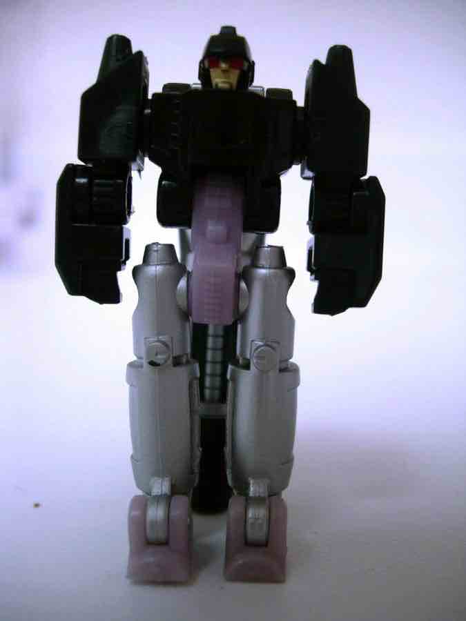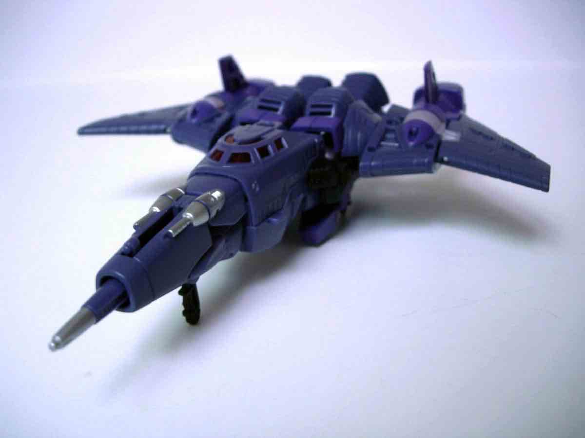 One of the highlights of this release is Nightstick, his Targetmaster partner. It's a little robot that turns into his gun, which is a great gimmick. In gun mode, he can be carried in Cyclonus' right hand, plugged in to a socket on his wrist (if the hand is stowed away), or plugged on to the top of the vehicle. The robot itself has jointed elbows, shoulders, hips, knees, and technically toes-- meaning that this gun has more articulation than your average Generation One toy.