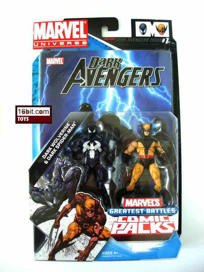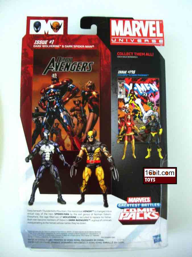 Item No.: Asst. 92702 No. 20868 Manufacturer:Hasbro Includes:Comic, Dark Wolverine figure Action Feature:n/a Retail:$12.99 Availability: Fall 2010 Other: One of the first "Dark Avengers" toys
