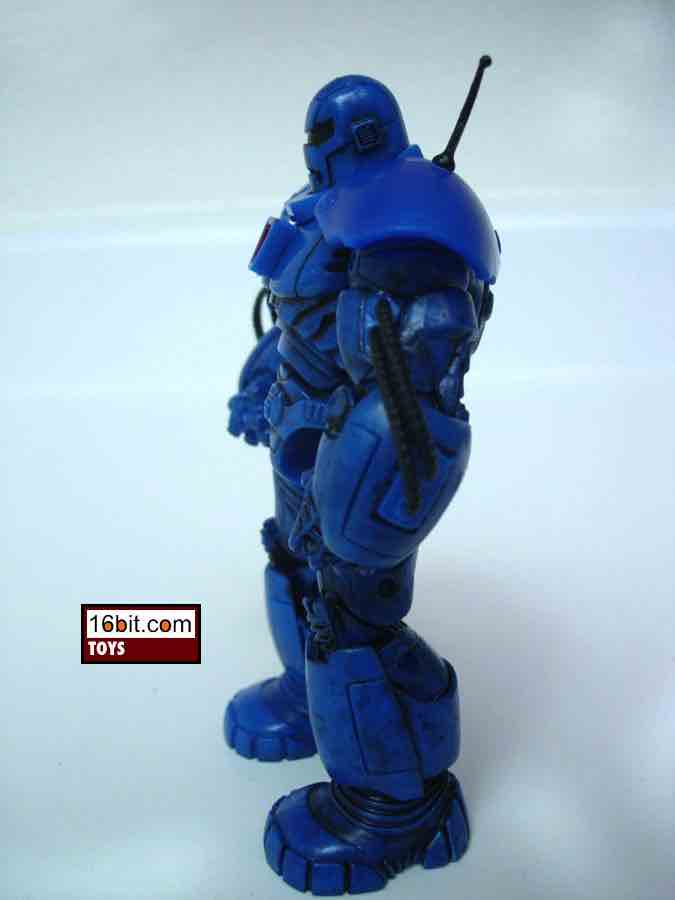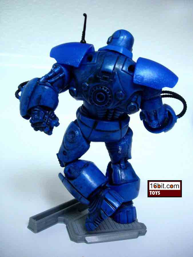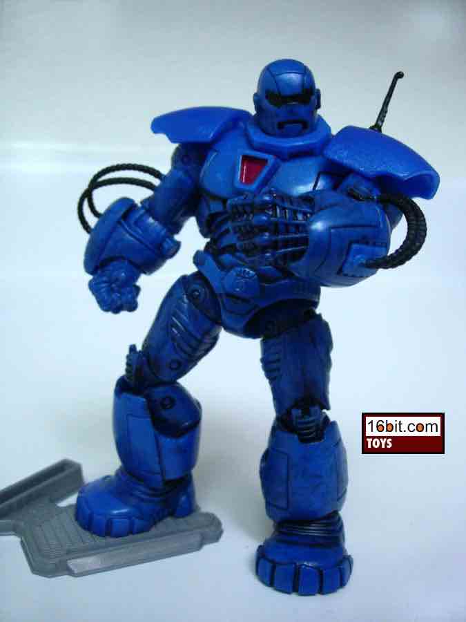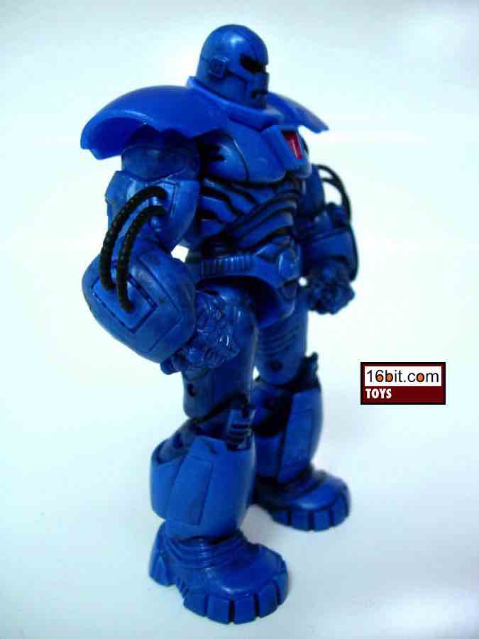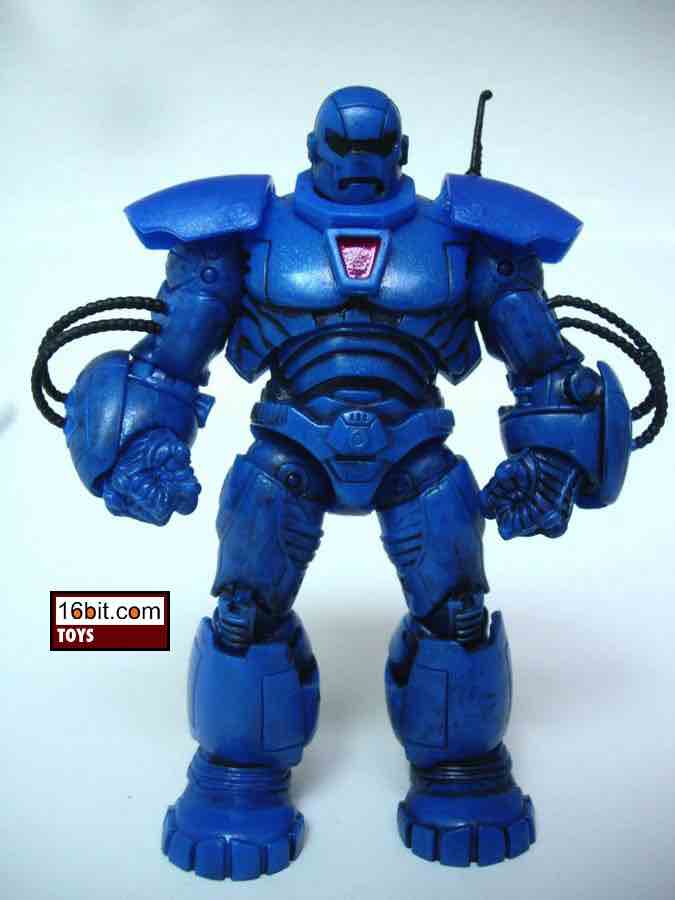 Towering over other Iron Man releases just slightly, the 5-inch tall armored version of Obadiah Stane is a real heavy. I mean, just look at him-- he's bulky, armored, and has no visible guns but two big blue fists. It's gorgeous. Marvel's big bulky guys always look really cool in most of the artwork (see: Apocalypse, Thanos, Hulk) but the toys don't always translate (see: Hulk). Iron Monger works nicely because they got all the bulk and heft here and it really works. This big blue guy has a ton of articulation, but because of his unique structure he isn't exactly super-poseable. Sure, he has 18 meaningful points of articulation, but his hips just swivel, same as his ankles. With his giant feet, the Iron Monger is in no danger of falling down (or needing his display stand). He has some wires hanging off him, plus there are some armor bits which move-- the wrist armor, for example, can rotate around his forearm and the shoulder pads are also slightly articulated.
