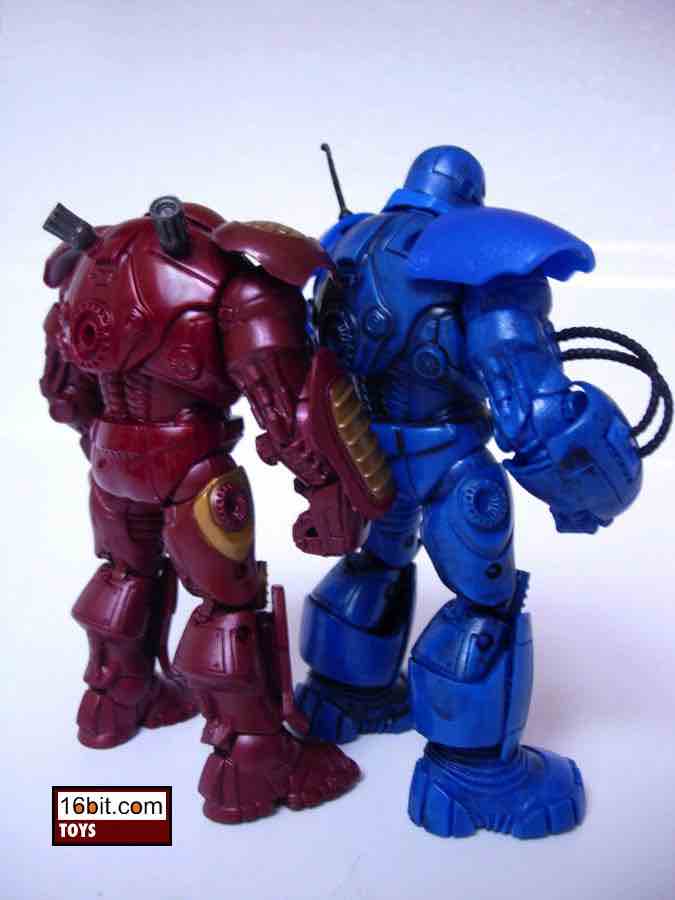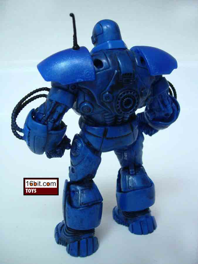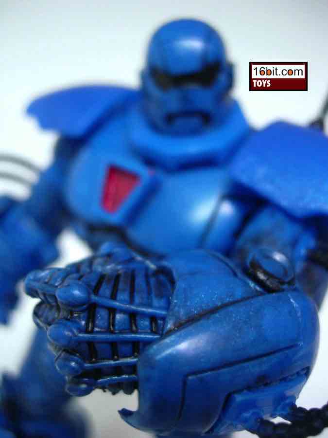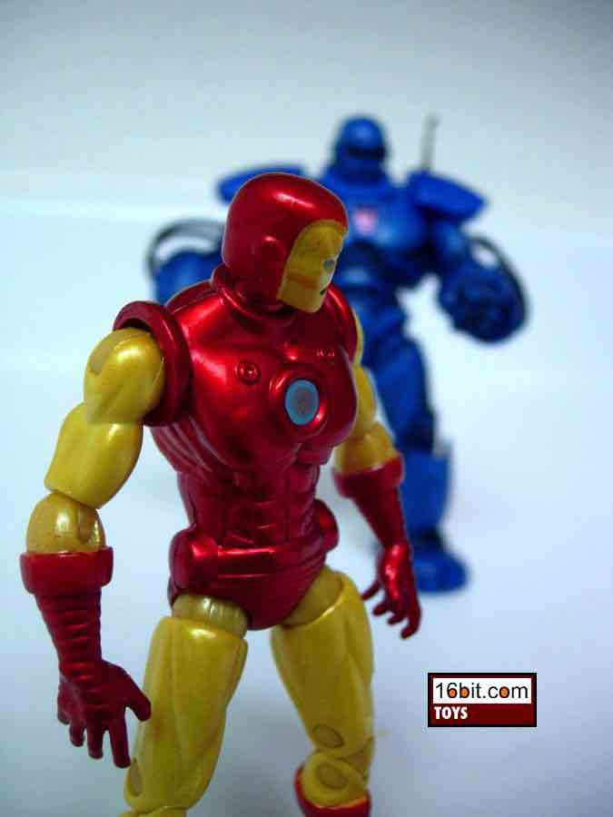 While the packaged photo shows what seems to be a metallic blue painted figure, the production Iron Monger is cast in blue with some black highlights (darklights?) and dash of red. The simple deco works for the figure quite well, and he does look a little dirtier than probably necessary. Some of the color is a little sloppy-- some red got out from the central reactor on his chest-- but it doesn't change the fact that this is one big mean looking pile of parts. I was getting worried Hasbro couldn't pull off big mean dudes at this scale, but Iron Monger shows that you can really do some great stuff in this line.