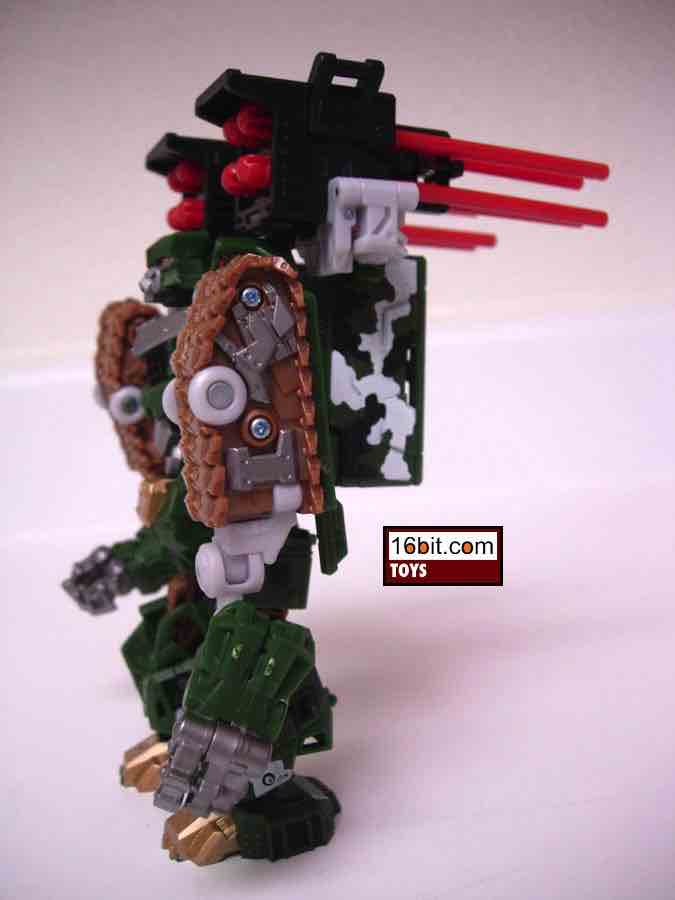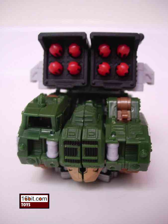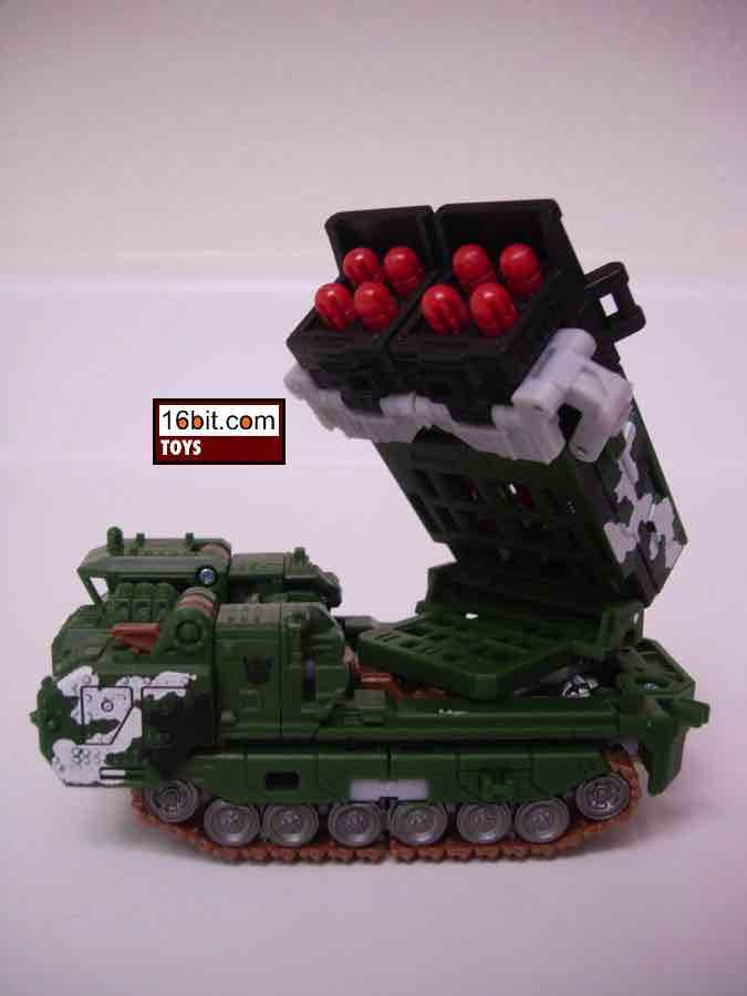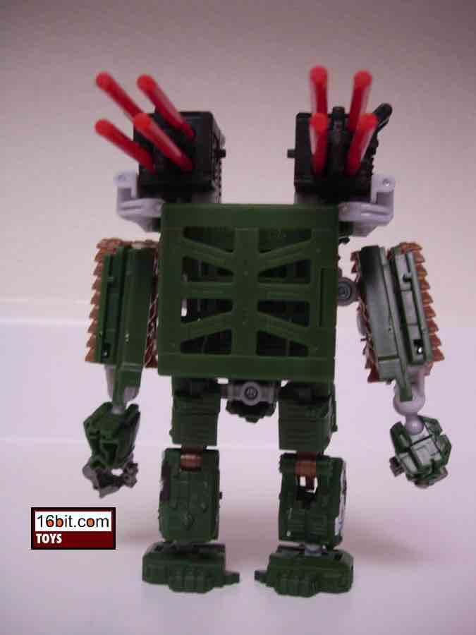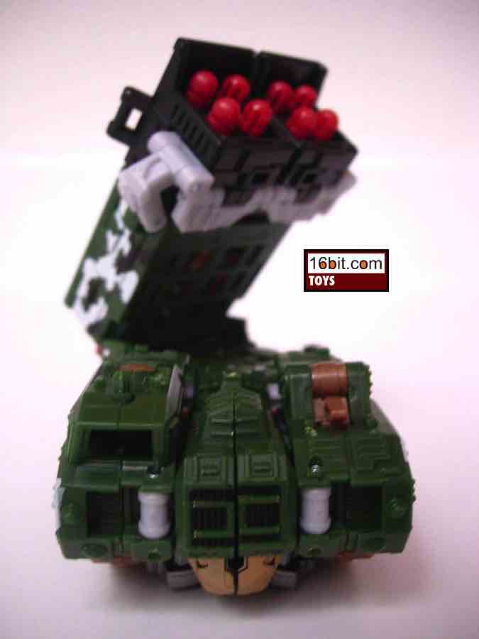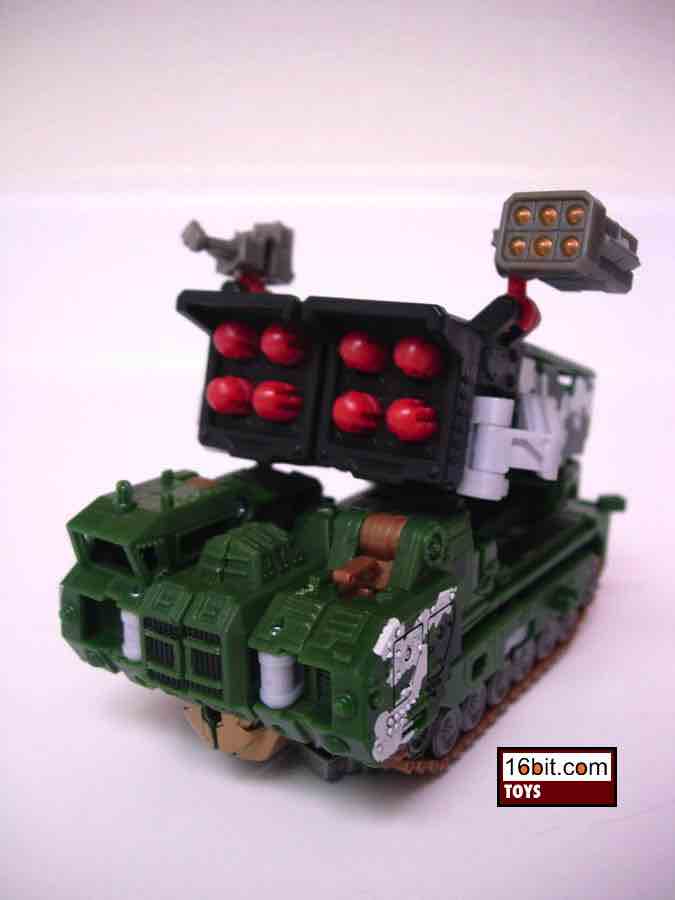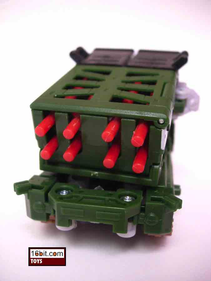 Transformers vehicles generally have little articulation, but this one has four rolling wheels and a missile rack which can rotate or pivot up and down slightly. Due to obstructions from the vehicle, it can turn about 180 degrees and flip up to about 90 degrees. He also has these ugly bars hanging off his racks, and these allow certain weapons included with other toys (specifically Breacher and Darkmount) to be placed on the figure, as seen in the pictures at the top of the gallery below. I suppose it's a nice option-- from 2002 to about 2005, figures had big posts on them to connect Mini-Cons-- but it doesn't really enhance the toy, and these extra weapons are somewhat tough to come by as of now. It seems like a line-wide gimmick that Hasbro isn't really interested in fully supporting with something like, oh I don't know, a name.
