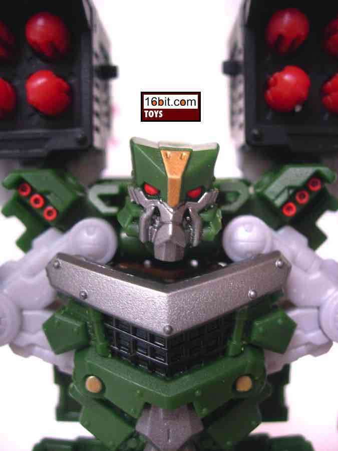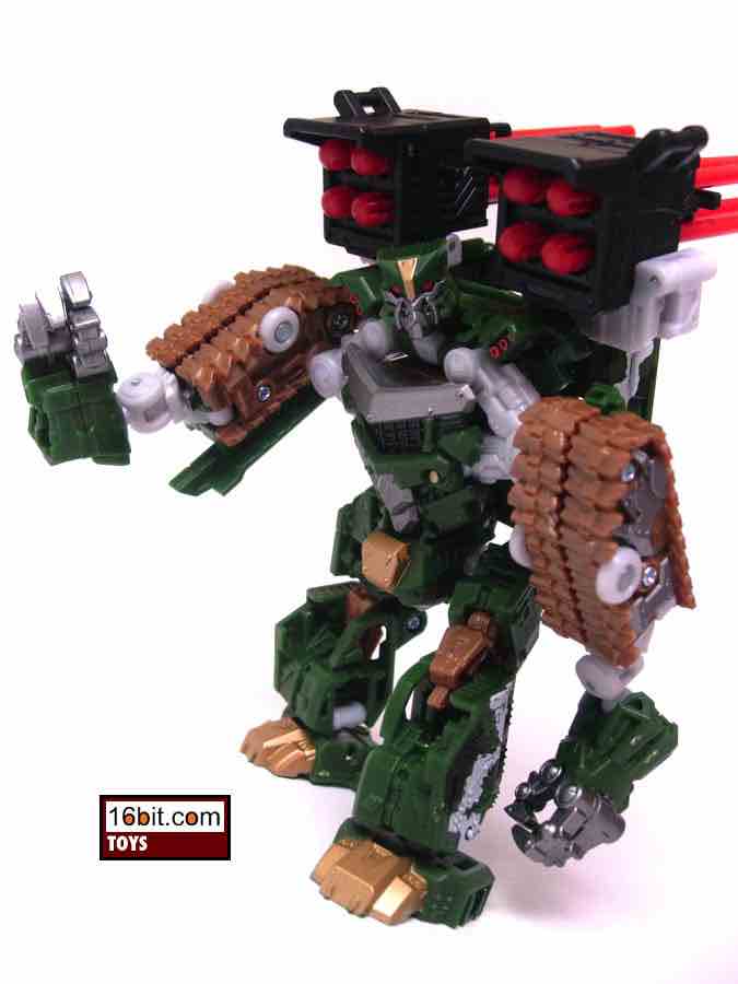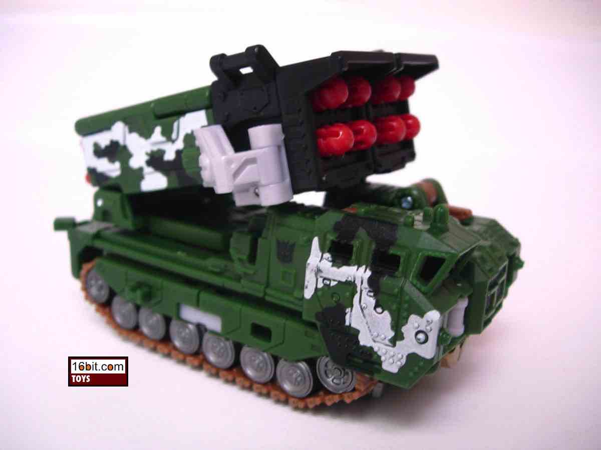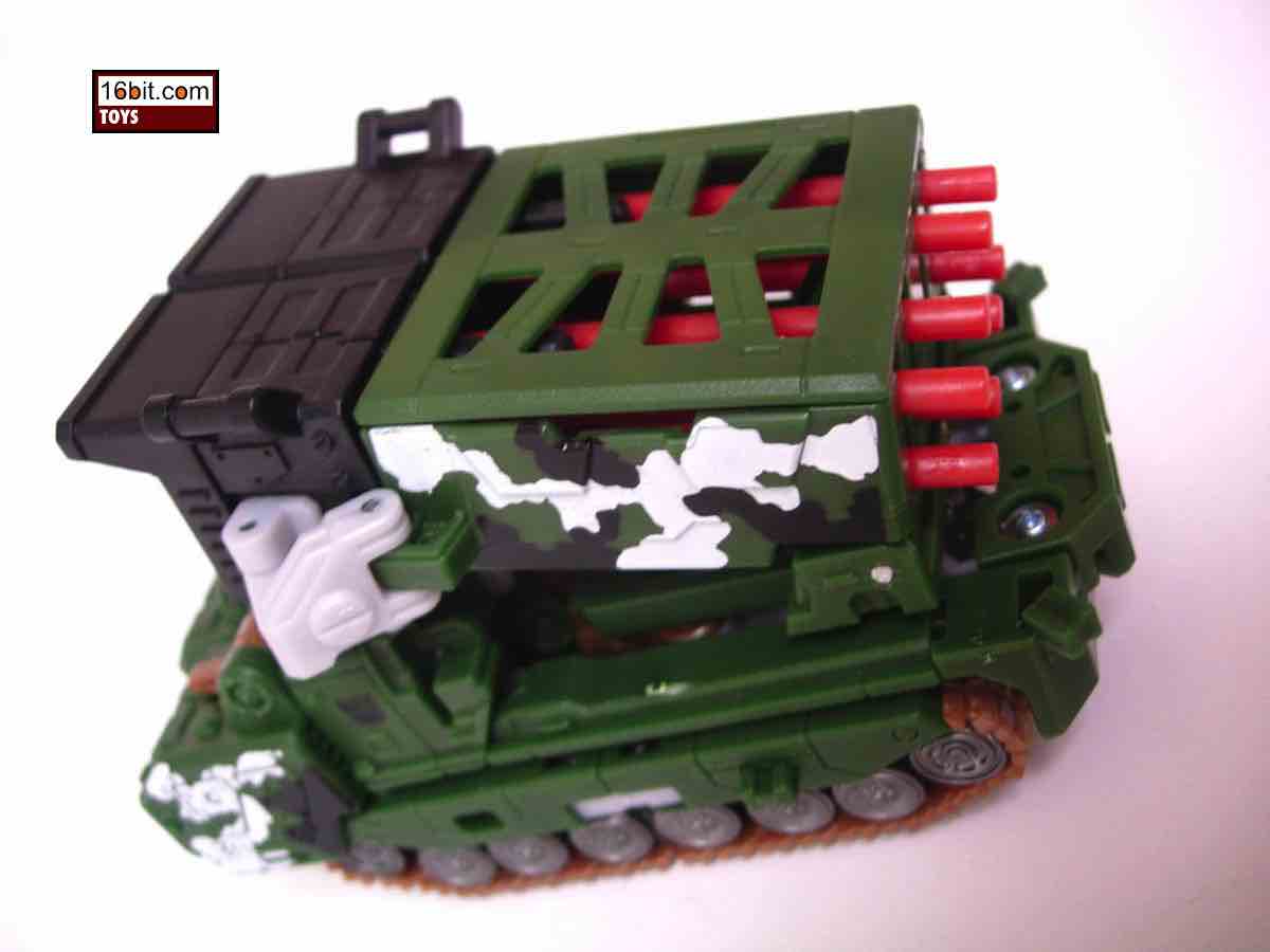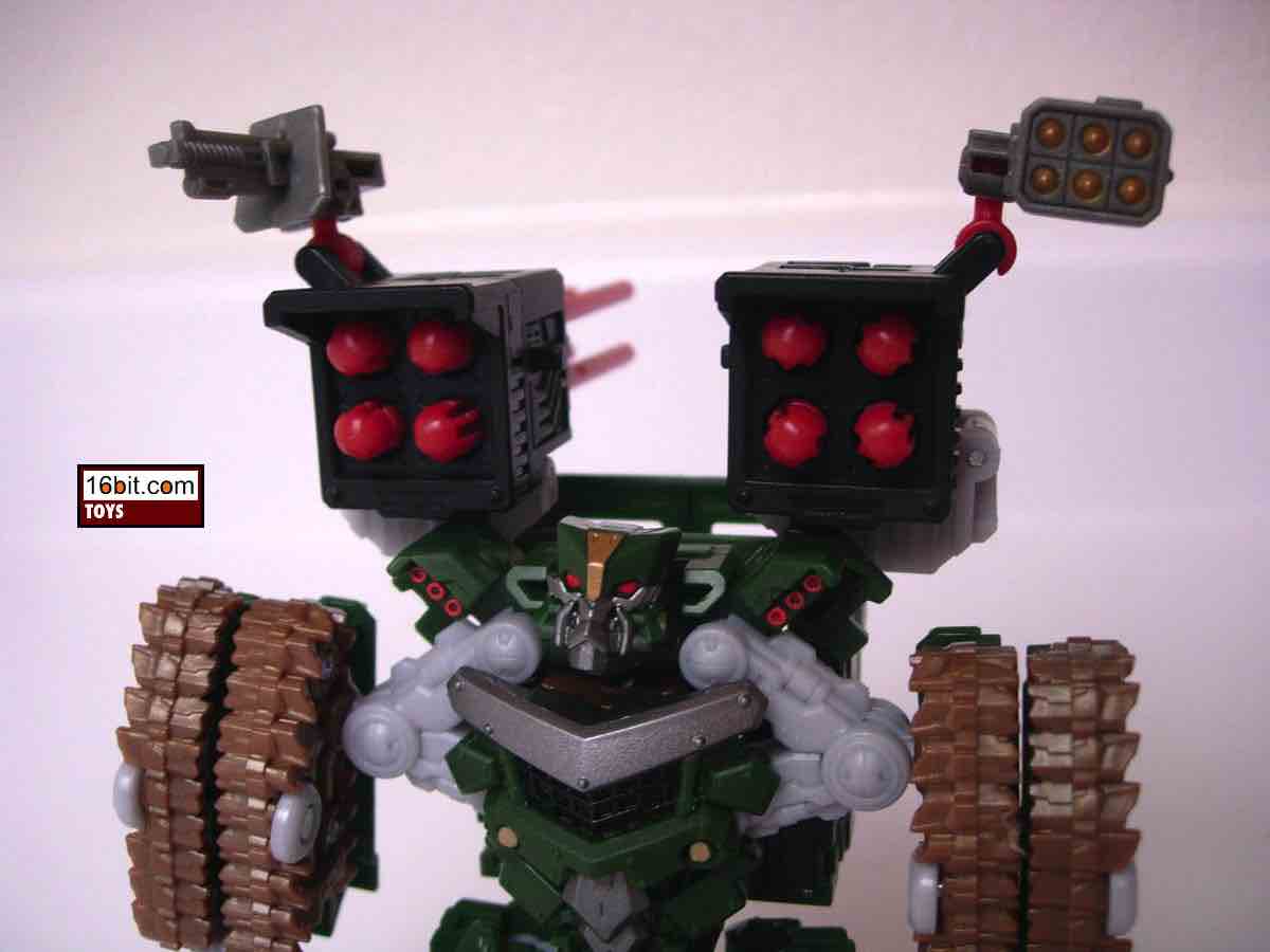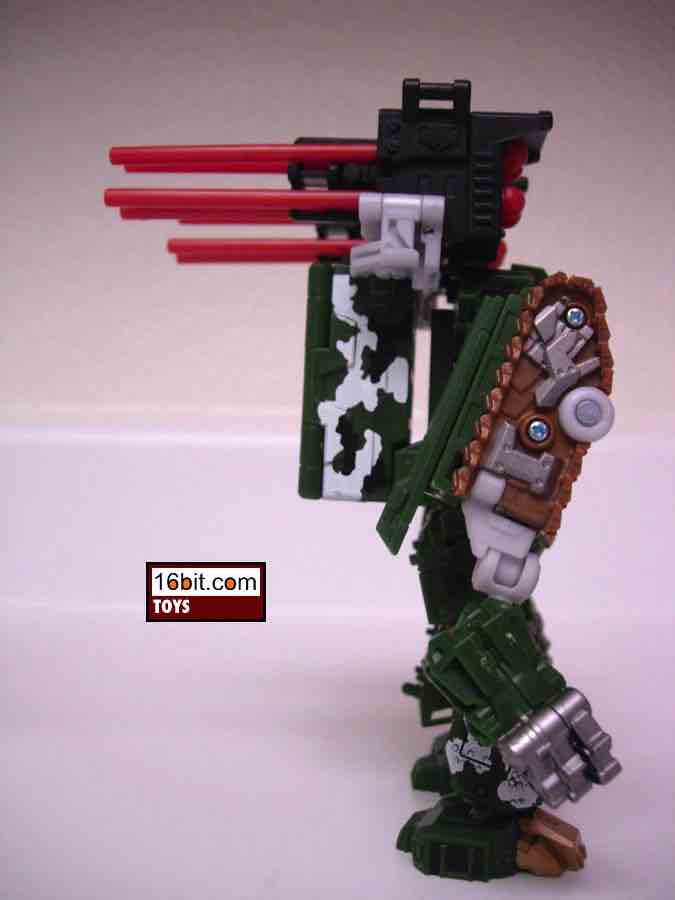 Transformers vehicles generally have little articulation, but this one has four rolling wheels and a missile rack which can rotate or pivot up and down slightly. Due to obstructions from the vehicle, it can turn about 180 degrees and flip up to about 90 degrees. He also has these ugly bars hanging off his racks, and these allow certain weapons included with other toys (specifically Breacher and Darkmount) to be placed on the figure, as seen in the pictures at the top of the gallery below. I suppose it's a nice option-- from 2002 to about 2005, figures had big posts on them to connect Mini-Cons-- but it doesn't really enhance the toy, and these extra weapons are somewhat tough to come by as of now. It seems like a line-wide gimmick that Hasbro isn't really interested in fully supporting with something like, oh I don't know, a name.