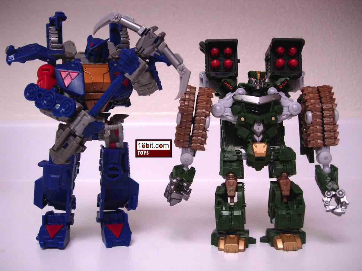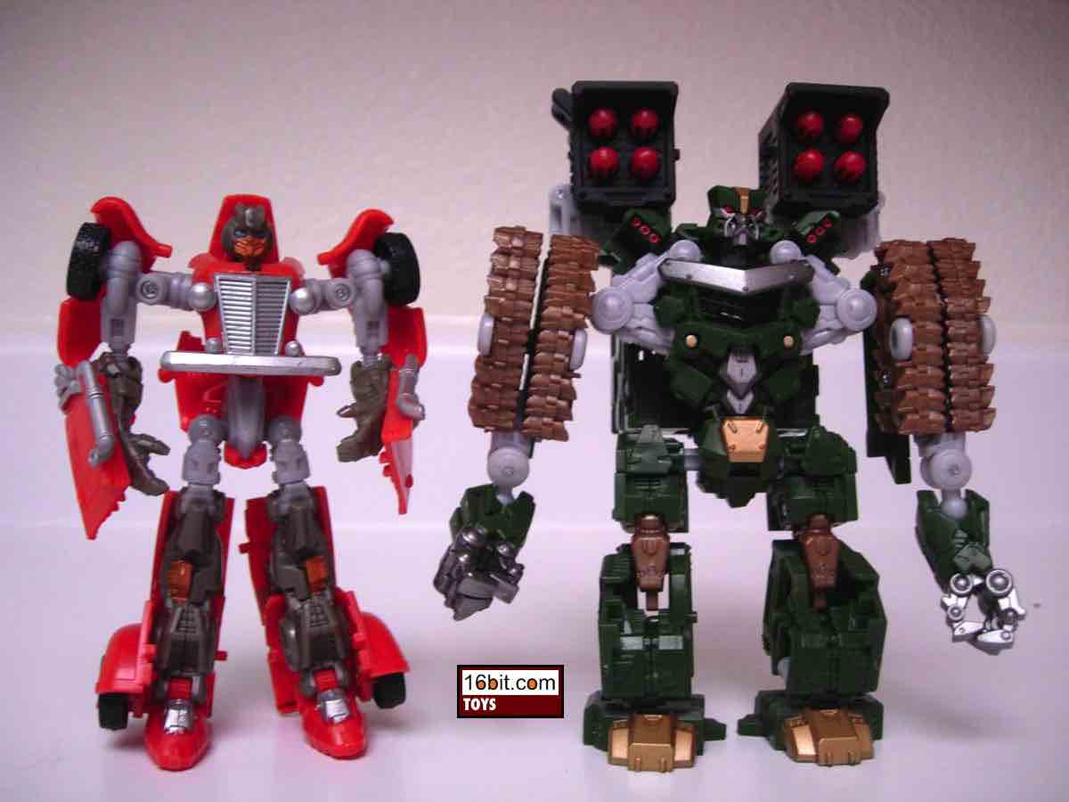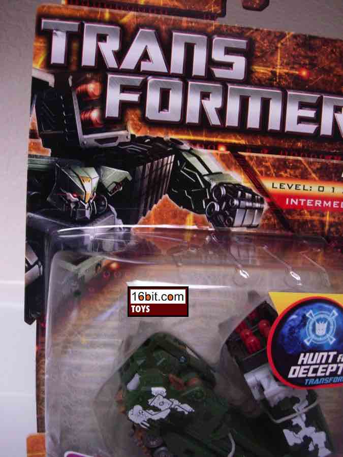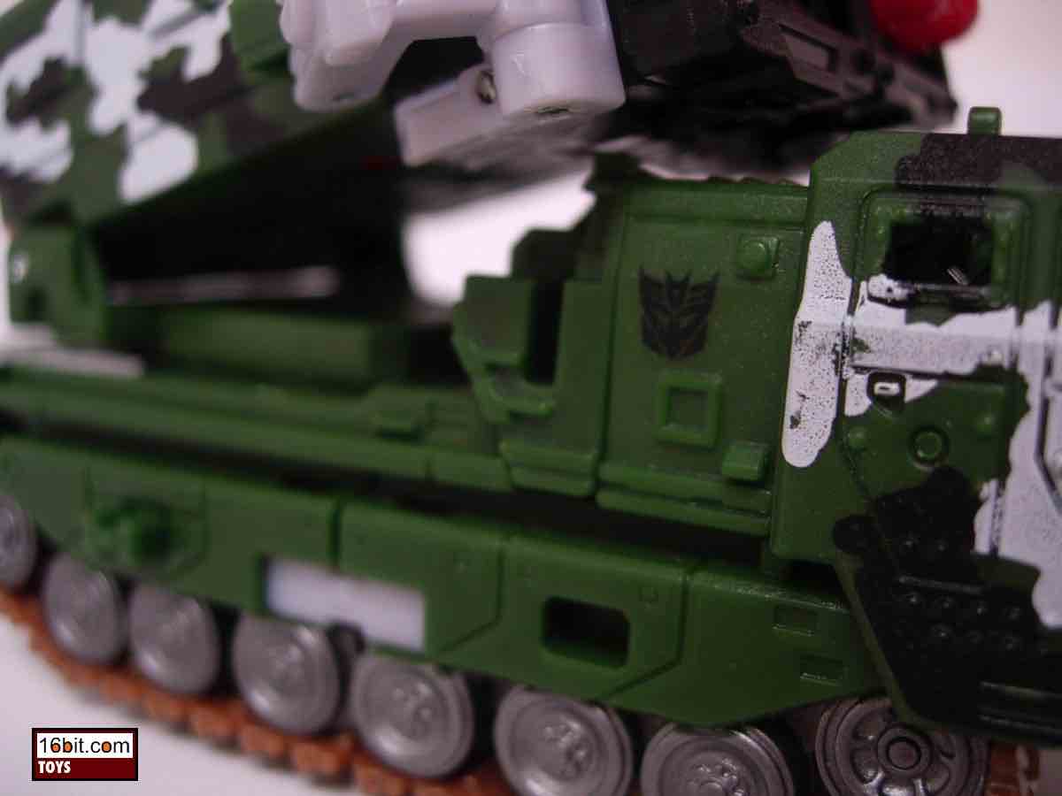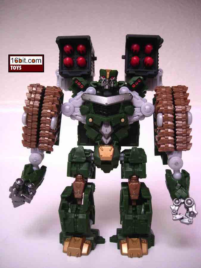 Transformers vehicles generally have little articulation, but this one has four rolling wheels and a missile rack which can rotate or pivot up and down slightly. Due to obstructions from the vehicle, it can turn about 180 degrees and flip up to about 90 degrees. He also has these ugly bars hanging off his racks, and these allow certain weapons included with other toys (specifically Breacher and Darkmount) to be placed on the figure, as seen in the pictures at the top of the gallery below. I suppose it's a nice option-- from 2002 to about 2005, figures had big posts on them to connect Mini-Cons-- but it doesn't really enhance the toy, and these extra weapons are somewhat tough to come by as of now. It seems like a line-wide gimmick that Hasbro isn't really interested in fully supporting with something like, oh I don't know, a name.