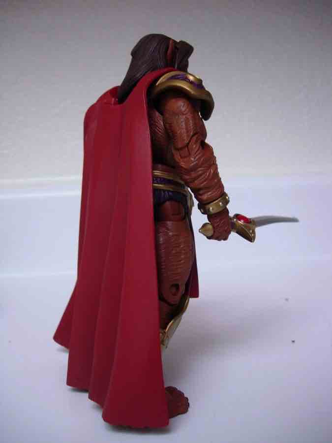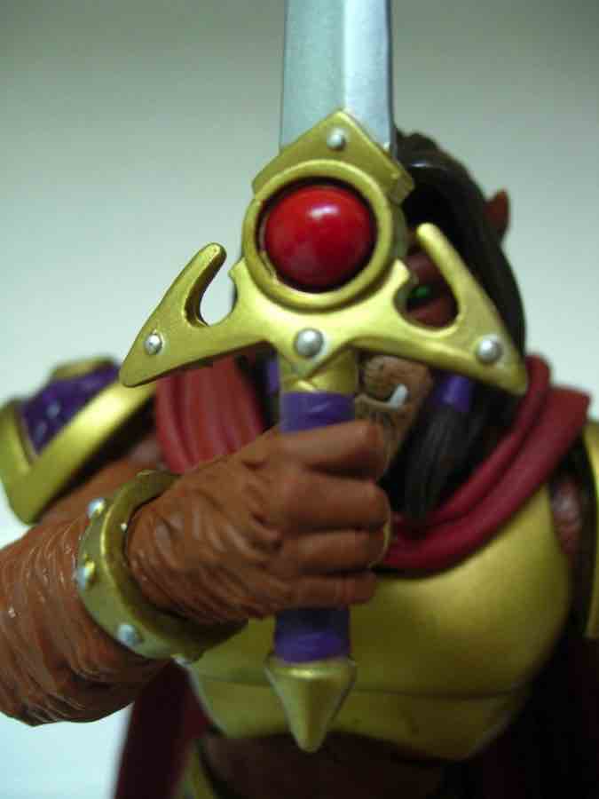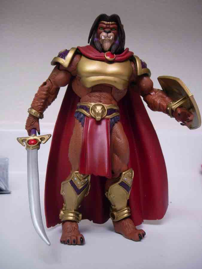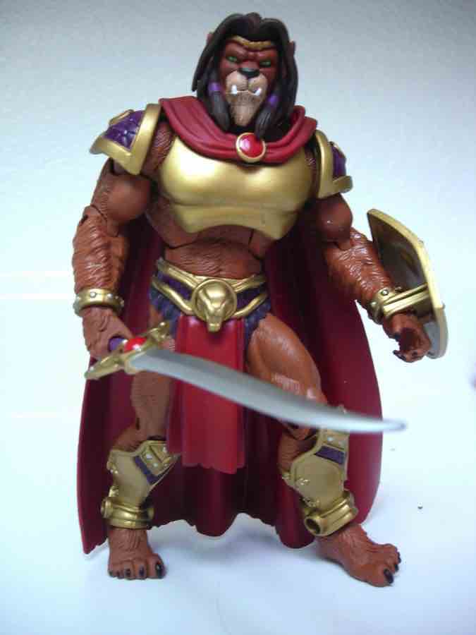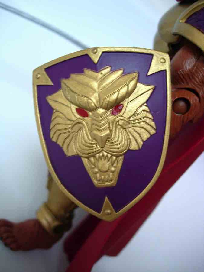 While I can mock the character all day long, I can't knock the quality. Sure, you've got a lion dressed like a combination of a Spartan from 300 and one of the Thundercats, but it's pretty. The bright red pieces of the costume go nicely with the gold, and there are al sorts of great little details all over him. His sword has a red crystal on it, and looks more than a little like Lion-O's Sword of Omens. There is more paint on the sword than most 1980s action figures get, and his shield is similarly stunning with a gold border, purple background, and a red-eyed embossed dragon making up the face of it. The coloring is great, and even the greaves are loaded with deco like little silver gems and purple highlights. Carnivus' claws are all painted too, plus he has painted hair, a lot of fur coloring in his face, and some form of feline or lion on his highly stylized belt buckle.