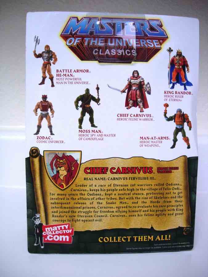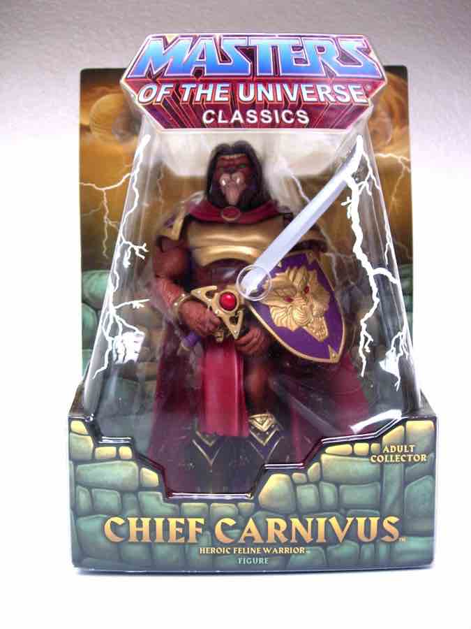 I've been asked by a lot of people why Mattel makes lines with the word "classics" in the name but makes new (or newish) characters like Chief Carnivus who, clearly, is not a classic. Heck, even fans of He-Man may not realize that this lion is the head of a race of feline warriors called "Qadians" from the Mike Young Productions incarnation of He-Man and the Masters of the Universe which aired at some point from 2002-2004. (I watched most of the show and flat-out don't remember ever seeing him.) The character had no analog in the 1980s lines, So that's why you don't know who this is but can name several of the Meteorbs.
