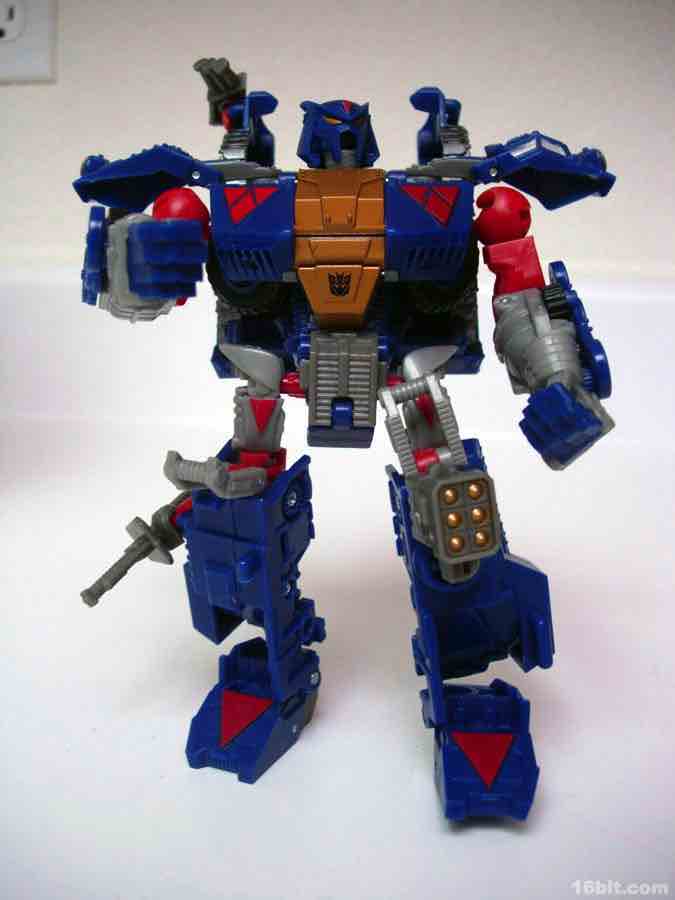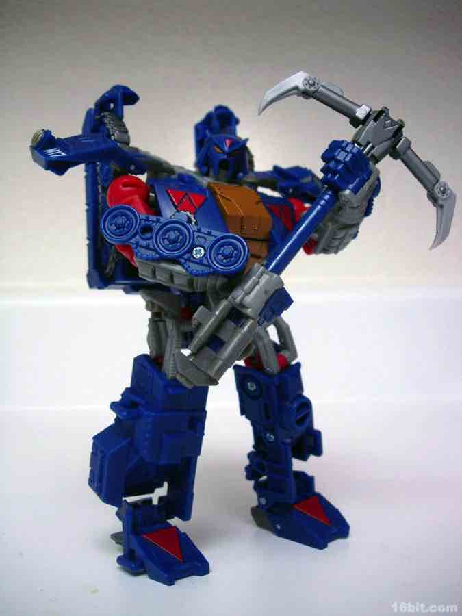 Darkmount's robot form is slightly more impressive. It has a lot of things that toys this size generally don't, like articulated fingers, wrist joints, double elbows, double shoulders, and other odds and ends to create a more poseable Decepticon dictator. There are a bunch of nice sculpted bits and while not a dead ringer for his comic inspiration, he certainly fits the bill of close enough. Oh, and he has a giant pickaxe thing as a weapon, which means he's either a zany gold prospector or a serial killer. Or both! The axe becomes the tank's cannon, and the fairly involved transformation process yields a solid vehicle and a great robot without pieces popping off and curse words being thrown about.