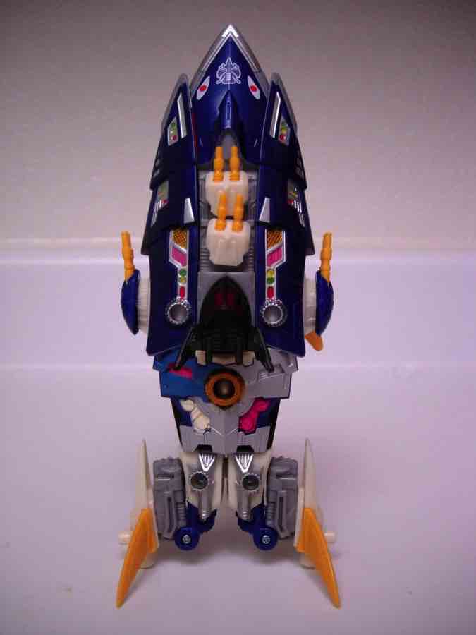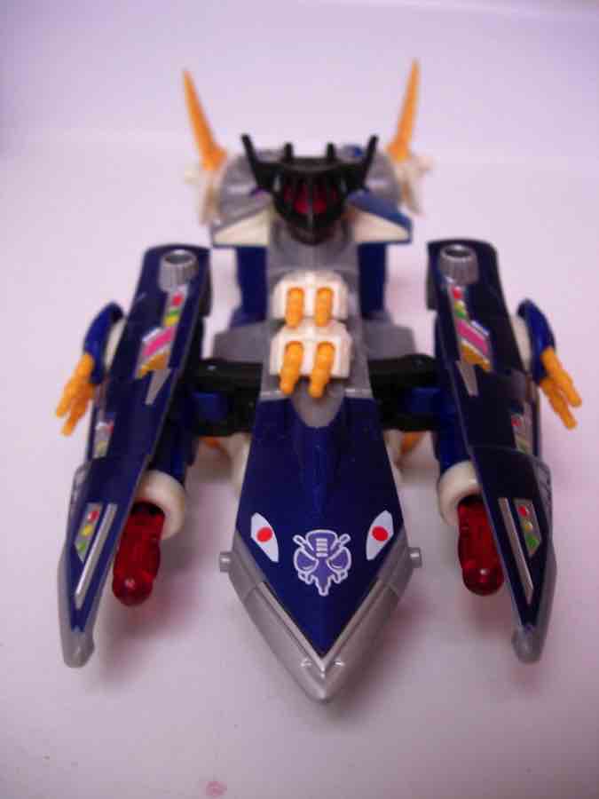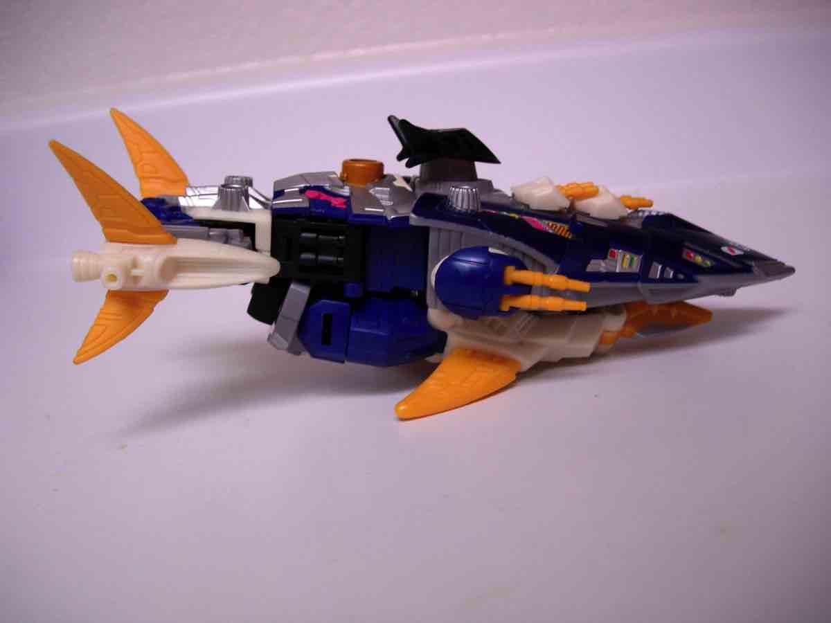If you have the original Sharkticon mold, you know that the "vehicle" mode is a shark-like revision of the Nemesis, a Decepticon battle cruiser. In vehicle or robot mode, Sky-Bite can be transformed to expose his twin rocket launchers which do work pretty well. In robot mode, most of the vehicle exists as a backpack to the robot with a few elements like his tail turning directly into hands. The rest is kibble, but it's a fairly fun and speedy transformation. You'll have fun with it.