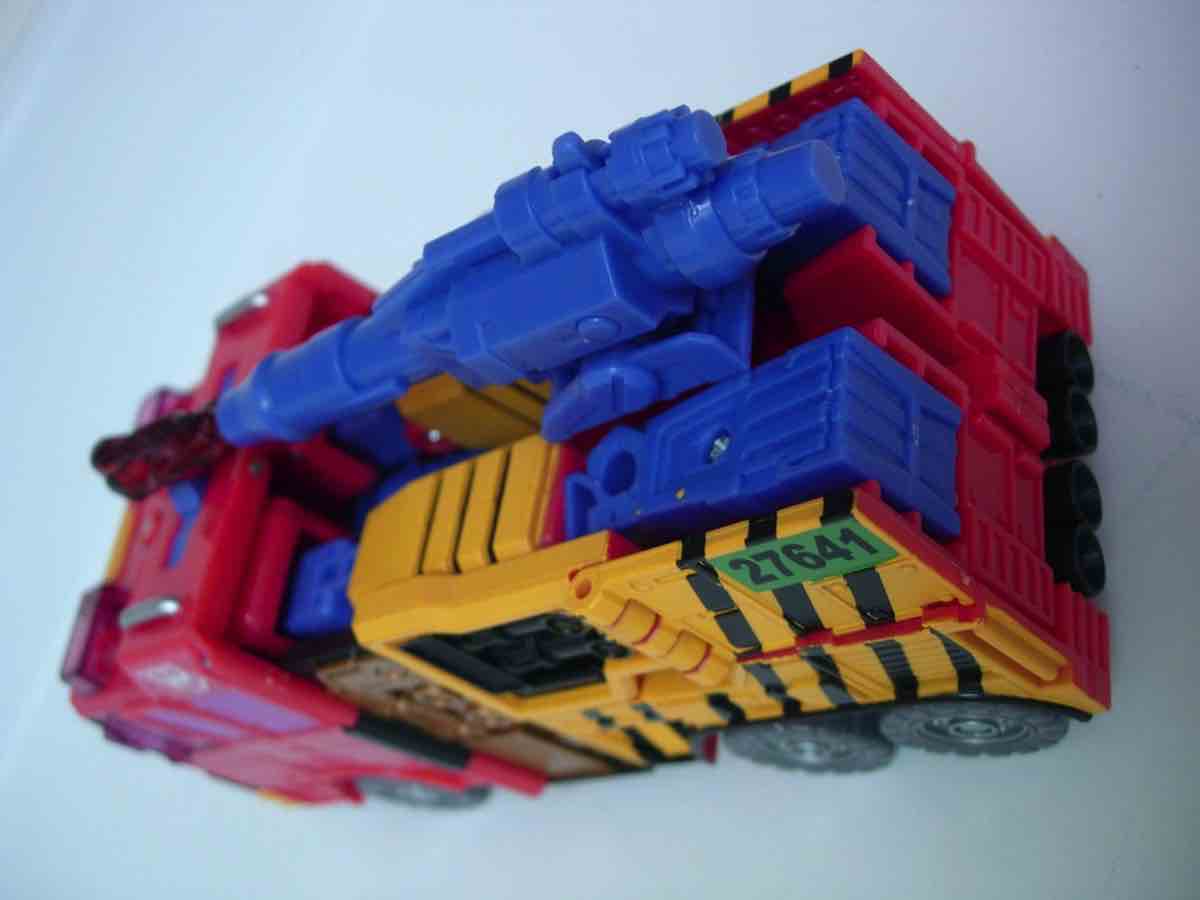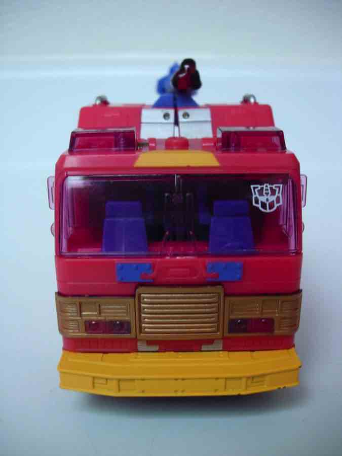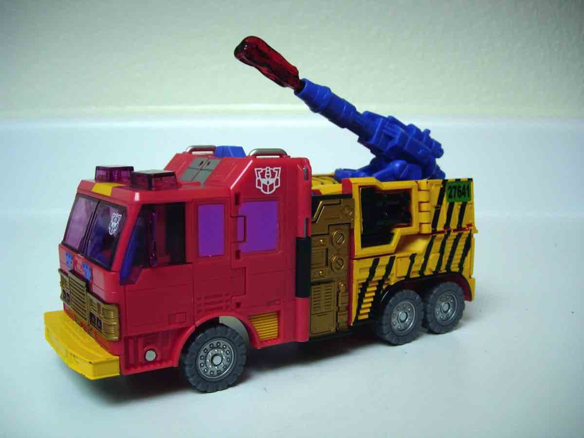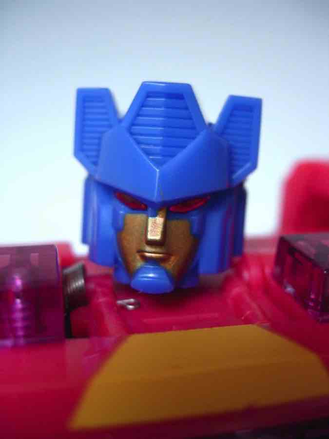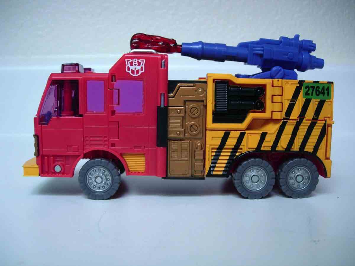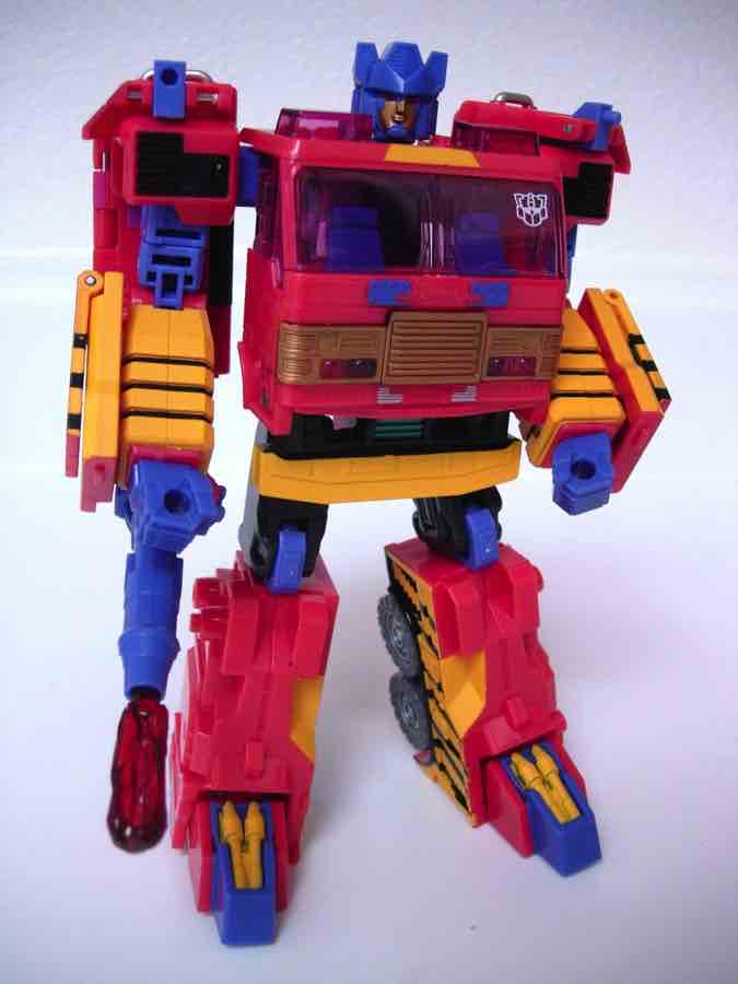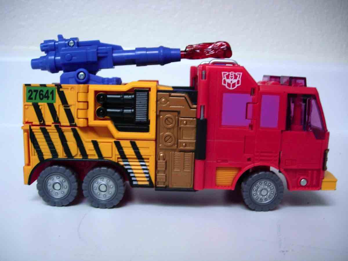 Lacking in his name or the word "AUTOBOT" stamped on his person, this 7-inch tall warrior. Just like Inferno, he's got a good amount of articulation with extra movement on his ankles, lots of swivels in his arms, and a built-in "water cannon" on his arm. Well, it was meant to be a water cannon, but now it shoots a clear red projectile which is presumably some sort of flame thing. As a toy he doesn't offer much new, but as an eye-blistering pile of awesome designed specifically to cost more and make you smile while parting with your money, he's a huge success. G2-era toys are generally considered to be some of the ugliest in the entire line which, while not entirely unfair, really comes to light when you look at toys like this.