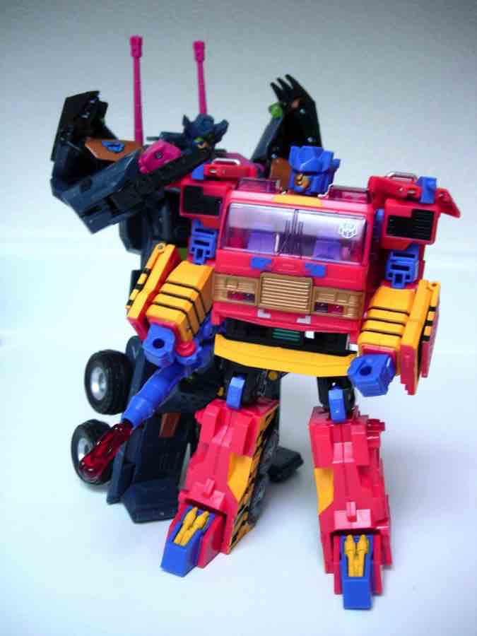 For whatever reason Fun Publications and Hasbro opted out of revising the head, but instead just painted up Universe Inferno from 2009 as the ugliest damn fire truck you've seen this side of the 1990s. Just look at it-- it's stunning. Inspired by late-era Generation 1 and early Generation 2 toys, Spark was molded in a pinkish red and absolutely slathered in paint. Or barfed on, might be good, with tons of extra yellow and black stripes bringing up the rear of this delightfully hideous toy. This thing looks like it stepped out of a Kmart ad from 1993, back when this sort of thing was normal.