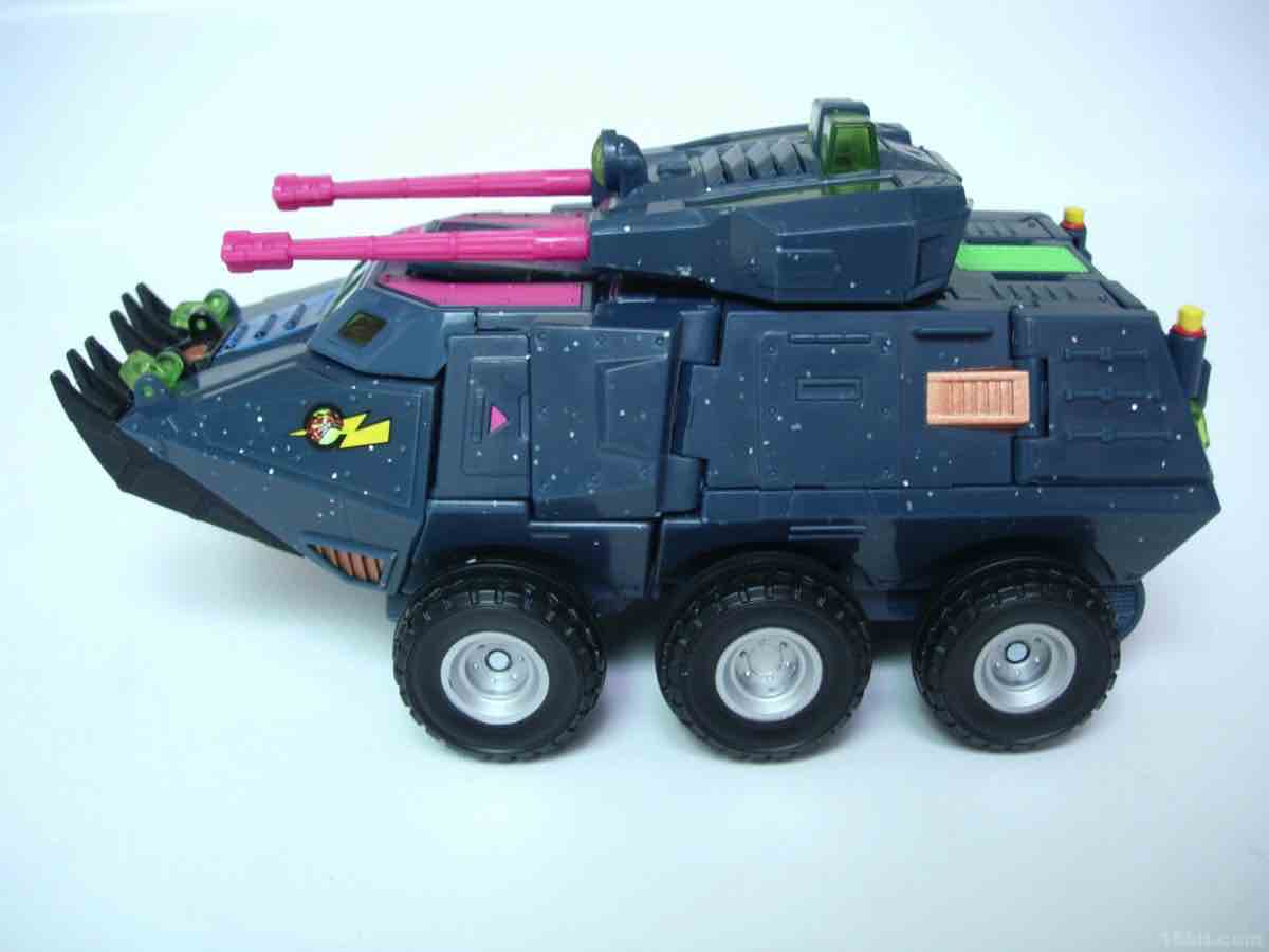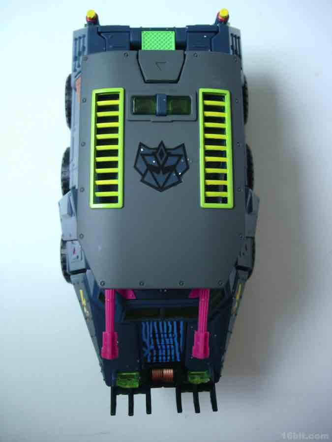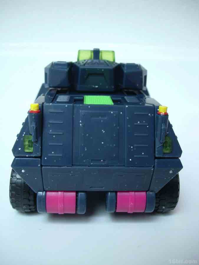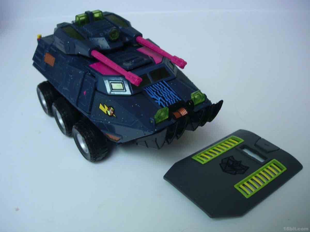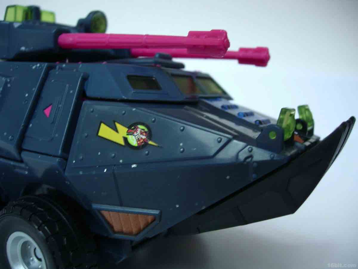 The vehicle mold has 6 rolling wheels, a rotating turret, and articulated lights on top of what is a sort of an opening grill/shovel thing in the front. As we are not experts in war vehicles at 16bit.com, I can only say that the colors and design combine to be one of the ugliest quasi-futuristic Decepticon vehicles I've had the fortune of seeing up-close.